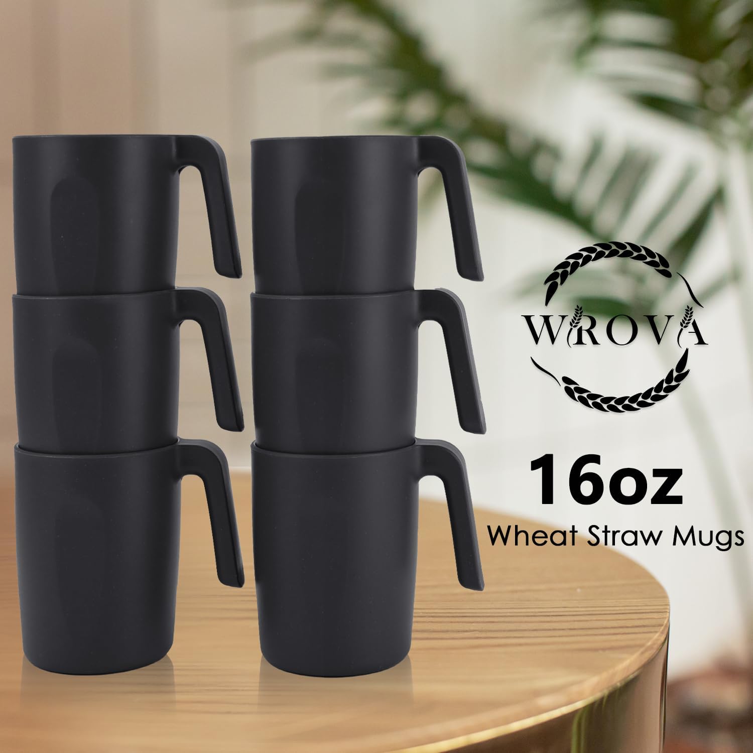 Wrova 16oz Wheat Straw Cups with handles set of 6-Plastic Cups Reusable-Unbreakable Kids Mugs-Dishwasher Safe & Microwave Safe-Ideal Plastic Mugs for Tea,Coffee,Camping,RV-Black