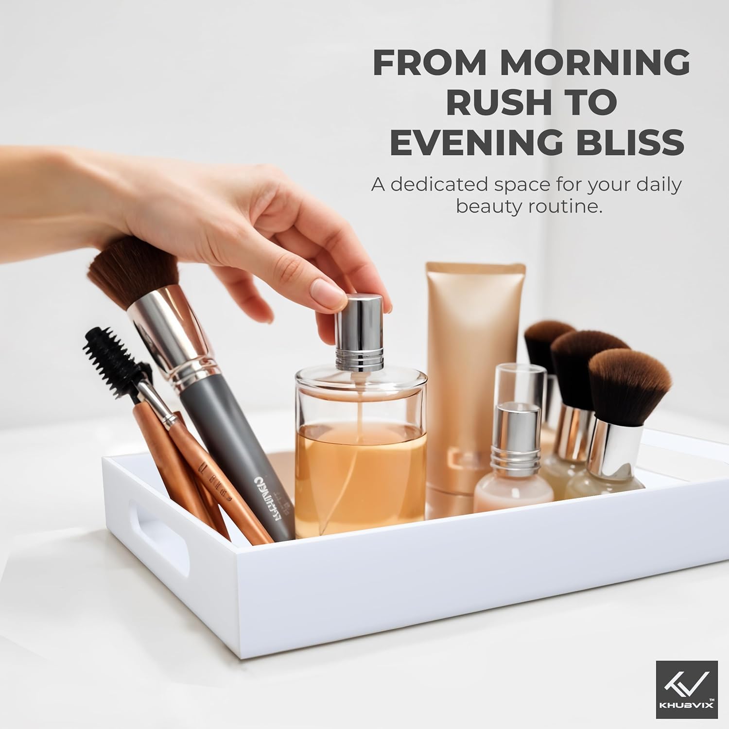 - From Casual To Lavish: You can place this white acrylic tray in your living room and decorate it with centerpieces. From storing your everyday beauty items to complementing any table setting to flaunting novelty mugs. This display tray sophistically harmonizes everything well. White serving trays for ottomans effortlessly blend style and functionality, making them a versatile addition to your home.