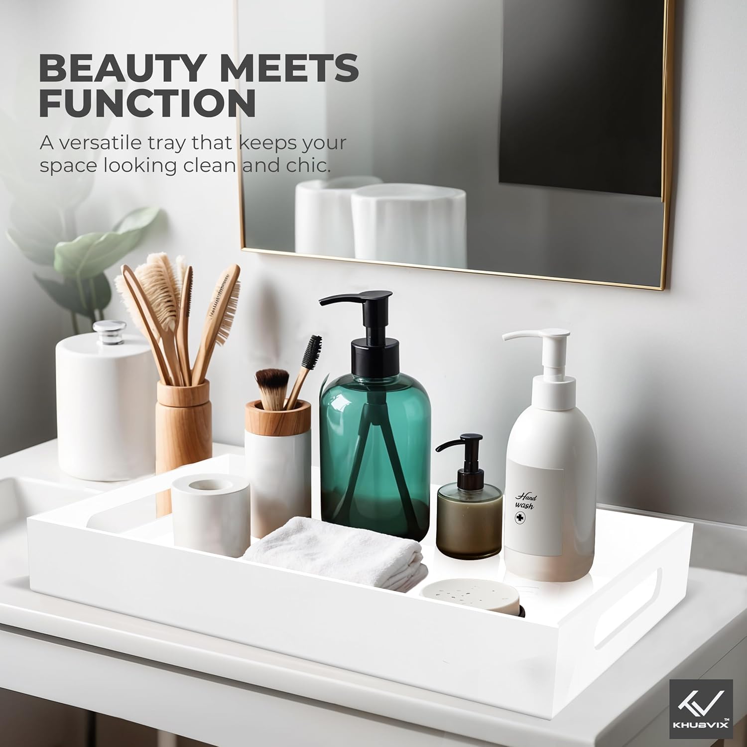 - Easy Access: White plastic trays are a great storage option for your countertop, vanity, kitchen utensils & bathroom essentials. Our white table tray makes everything look neat and organized saving us space. Our acrylic serving trays and platters only requires a damp warm soapy sponge or microfiber cloth for quick and effortless cleaning.