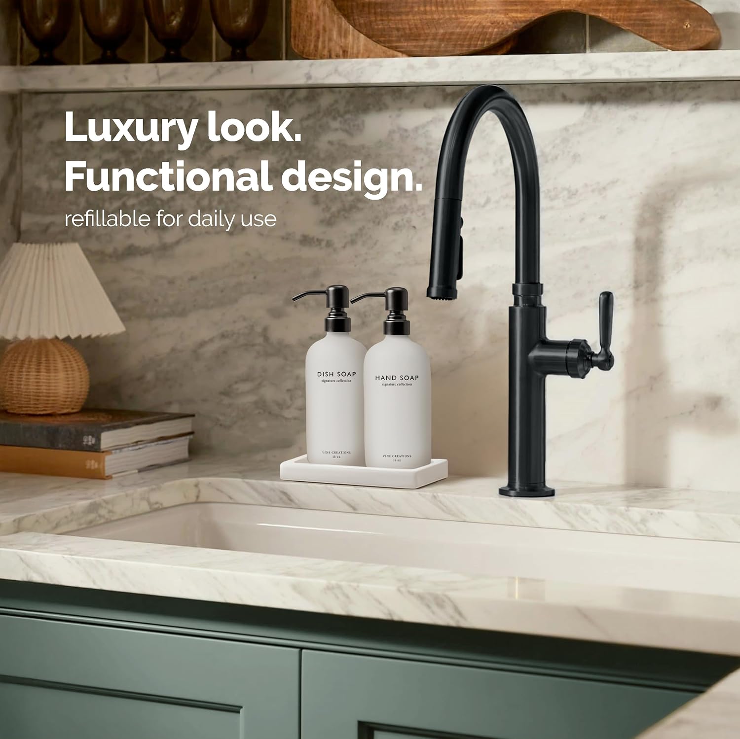 - STYLE YOU CAN FEEL – Heavier than standard dispensers, this hand and dish soap dispenser set of 2 brings substance and sophistication to your countertop. Built to last and made to impress—with a matching ceramic tray that keeps your set tidy, stylish, and perfectly organized.