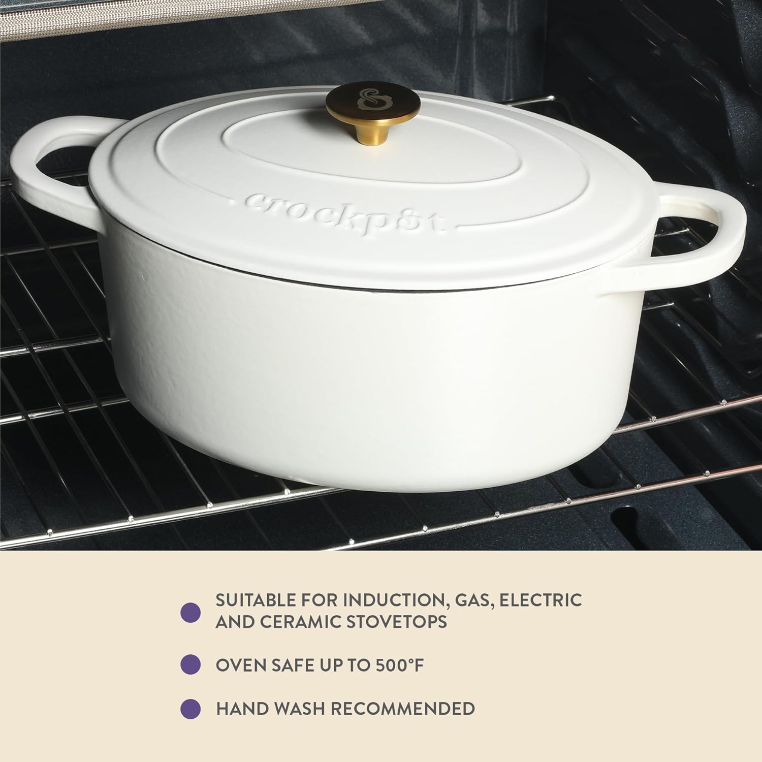Crock Pot Artisan 7-Quart Oval Dutch Oven With Lid, Enameled Cast Iron, Linen White With Gold Knob, Heavy-Duty Cookware for Baking, Braising, Roasting & Slow Cooking