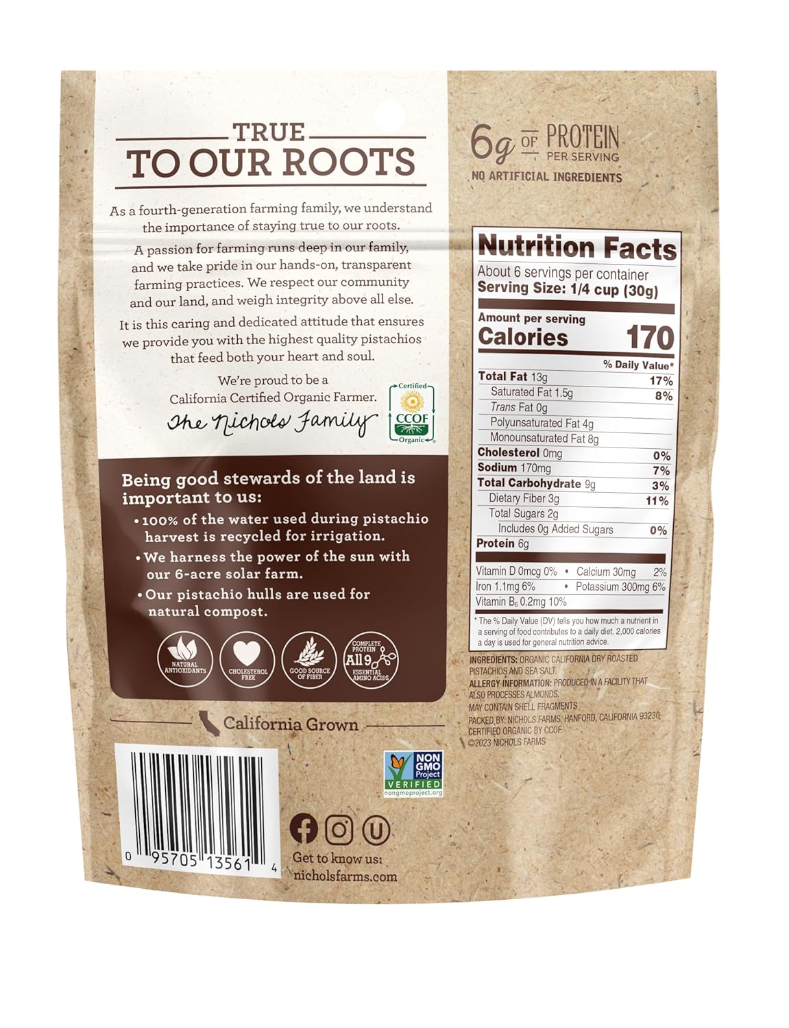 Nichols Farms Roasted with Sea Salt No Shell Pistachios, Kosher, USDA Certified Organic, Non-GMO, 6 Oz (Pack of 3)