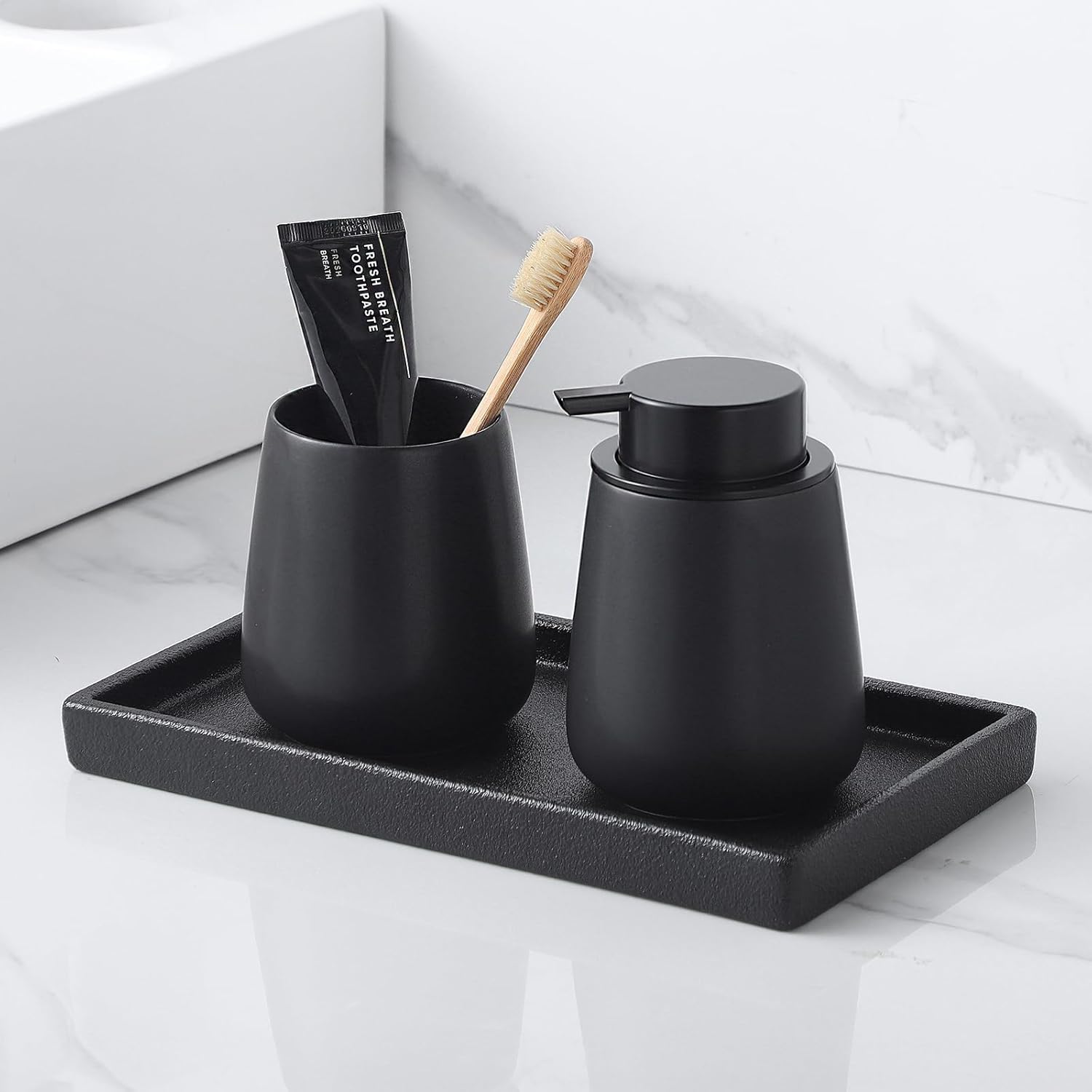 - 【Versatile】The black bathroom tray enhances the beauty of any space - use it as a bathroom vanity tray to display luxurious perfumes, as a kitchen countertop organizer, or as a minimalist jewelry tray on your room's dresser. Its unique shape and matte finish blend perfectly with modern, farmhouse, or industrial decor.
