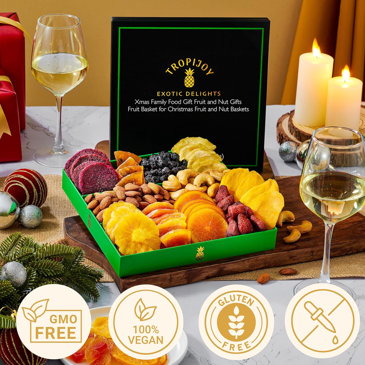 - HAND-PACKED – From crunchy cashew to chewy papaya in dried fruit tray, our dried fruit baskets gifts are hand-assembled with care for Christmas fruit gift baskets food.