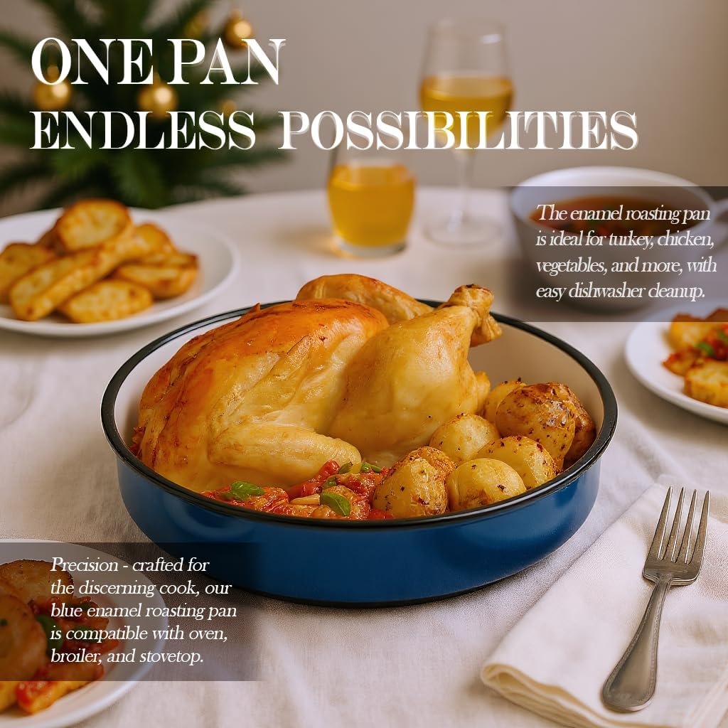 - Aesthetic Science:Large roaster pan The blue smooth surface and white inner wall are simple and elegant .The circular and flat bottomed design baking pan ensures even heating of food, accelerating cooking efficiency