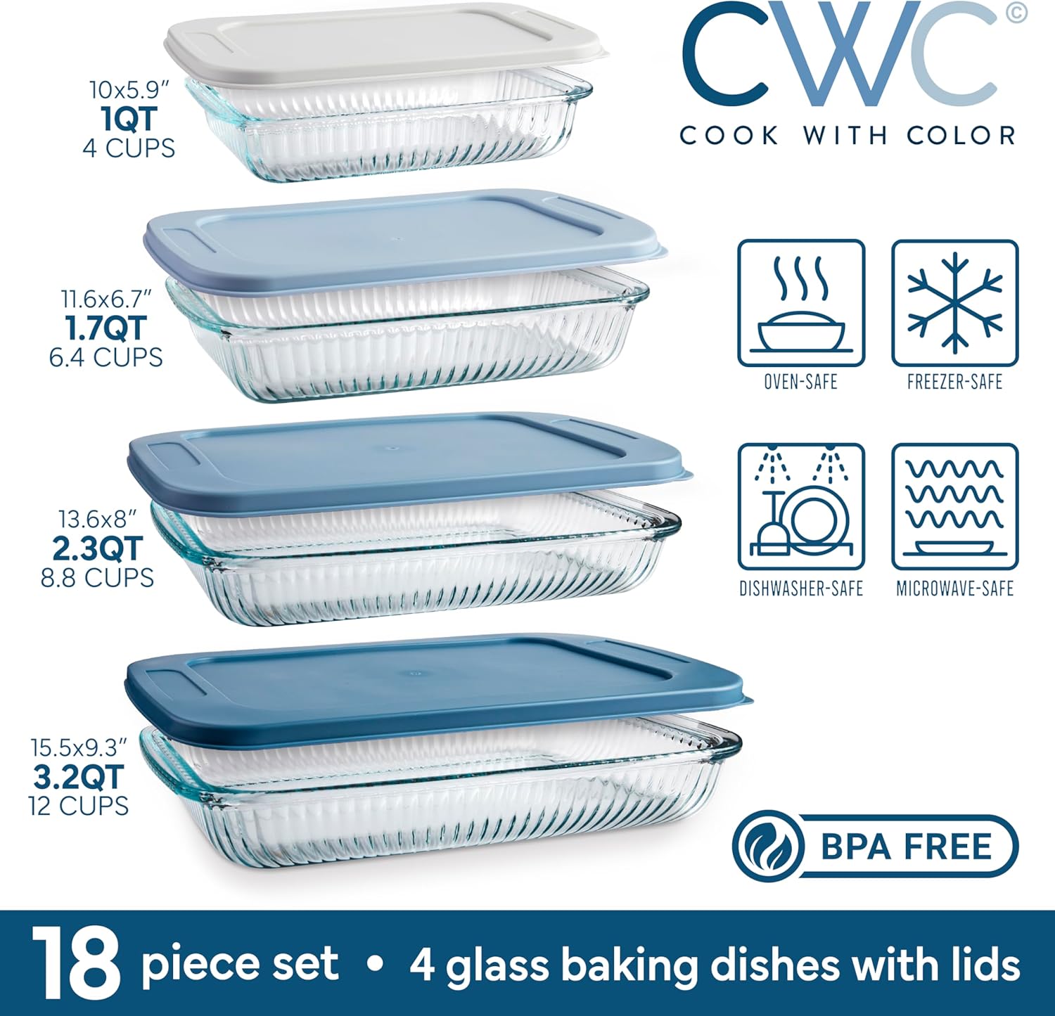 COOK WITH COLOR 8-Piece Deep Glass Baking Dish Set with Plastic Lids – Casserole and Food Storage Containers for Lasagna, Leftovers – Freezer-to-Oven, Microwave & Dishwasher Safe, Fluted Blue