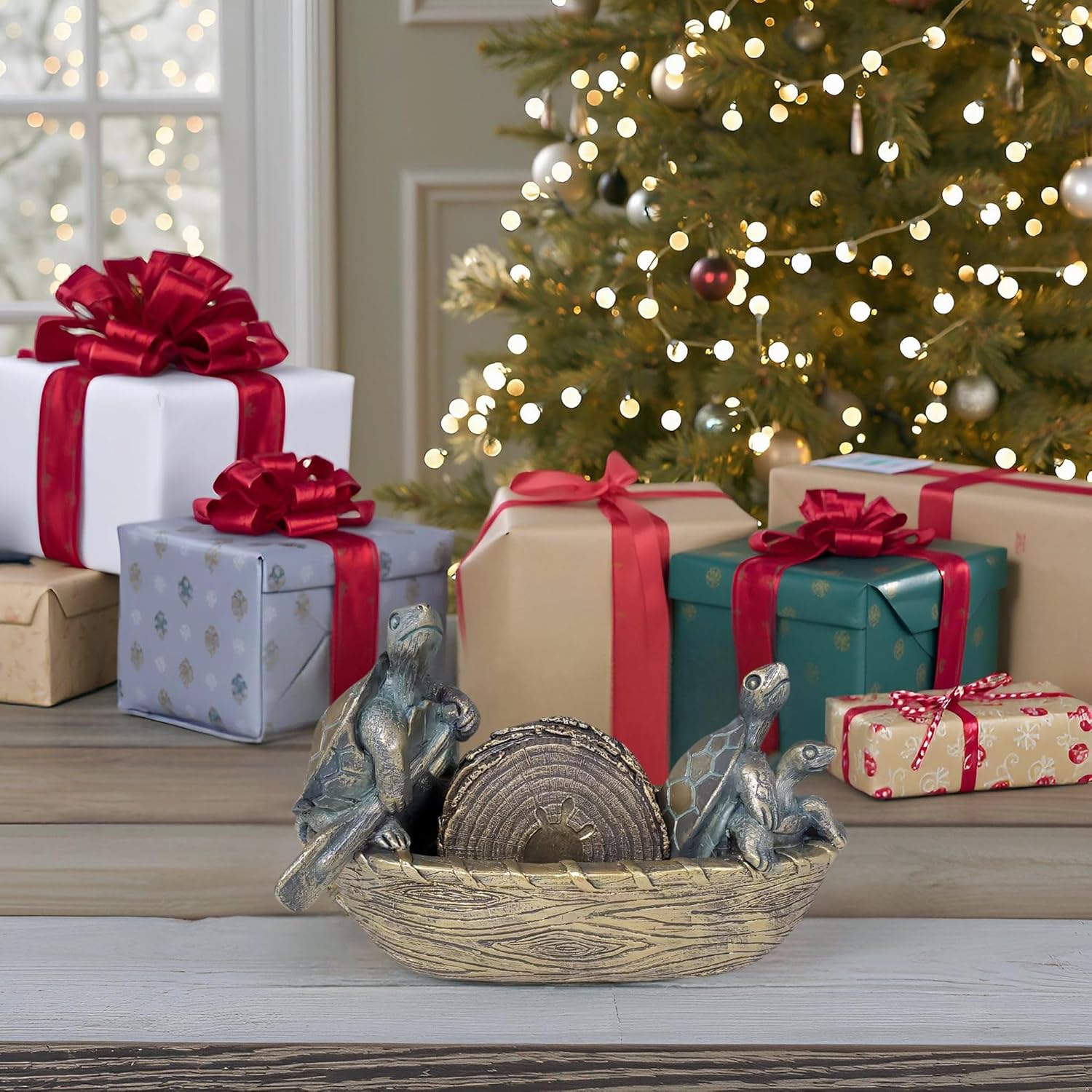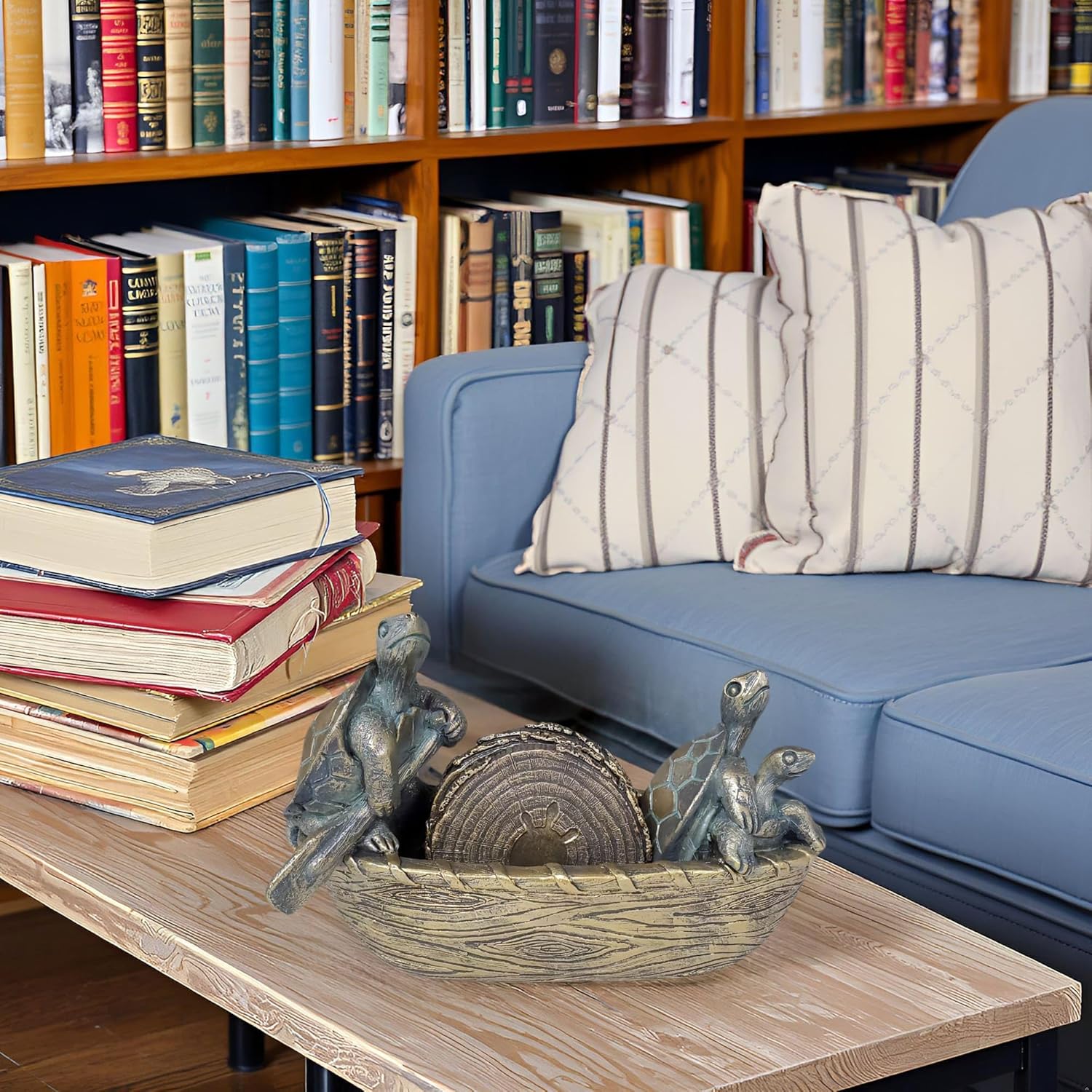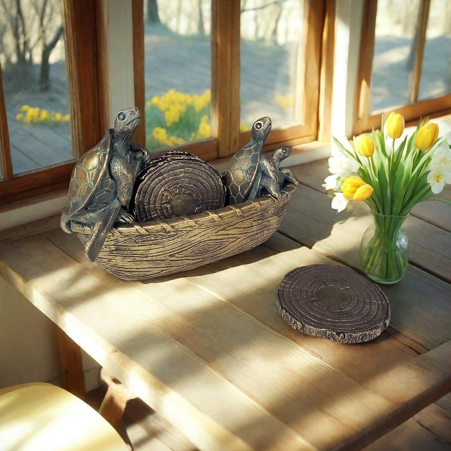 - Enhance your coffee table with these rustic coffee table coasters, featuring a handmade canoe design and adorable turtle figurines, perfect for rustic home decor or cabin decorations.