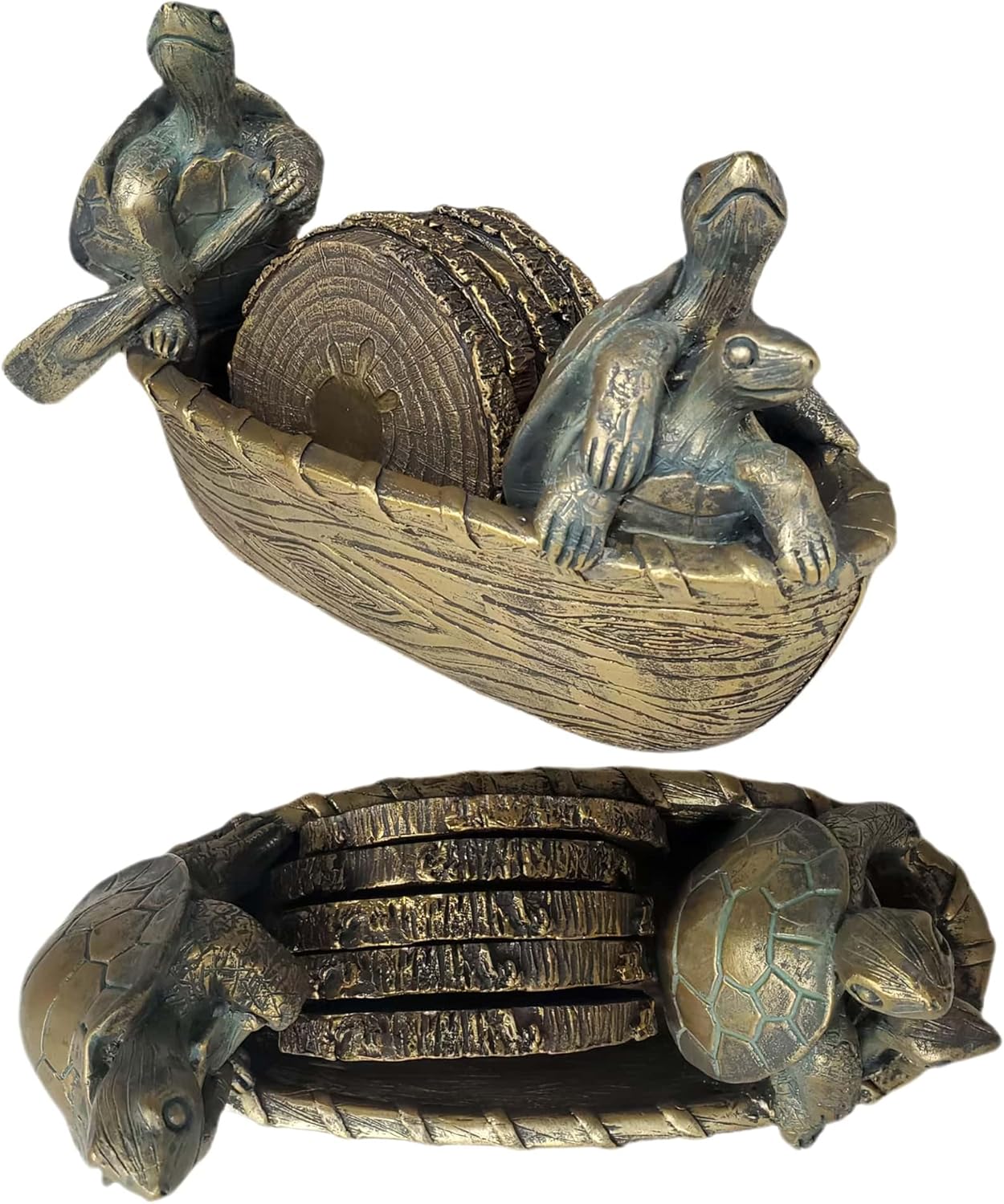 Turtle Coasters Set of 5 Rustic Coasters in Handmade Canoe Turtle Log Cabin Decor for The Home Drink Round Table Coffee Mug Wine Beer Bar Decorative Bronze