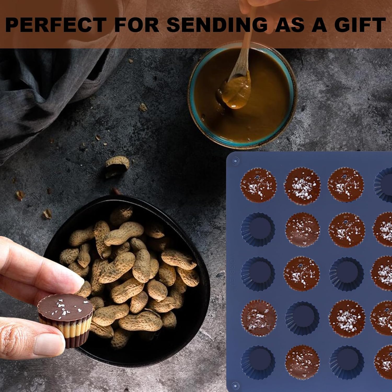- The silicone peanut butter cup mold is made of 100% premium food grade silicone material which possesses non-stick polished surface for each cavity, easy to pop out. And its temperature resists from -40 to 230 degrees Celsius (-40βto 440β).