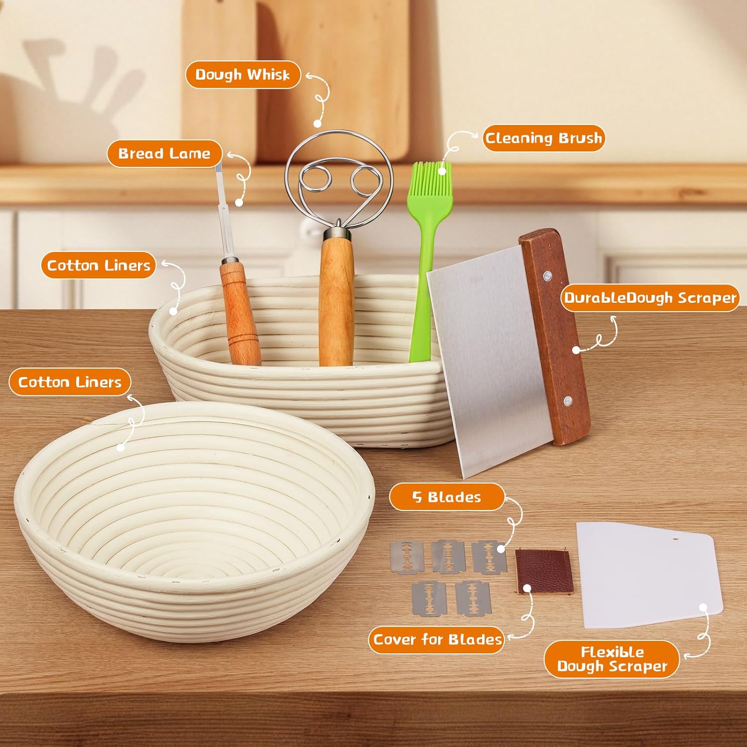 - Complete Sourdough Essential Kit – Includes 2 oval proofing baskets with liners, stainless steel scraper, Danish whisk, bread lame, and more—everything needed for artisan bread baking.