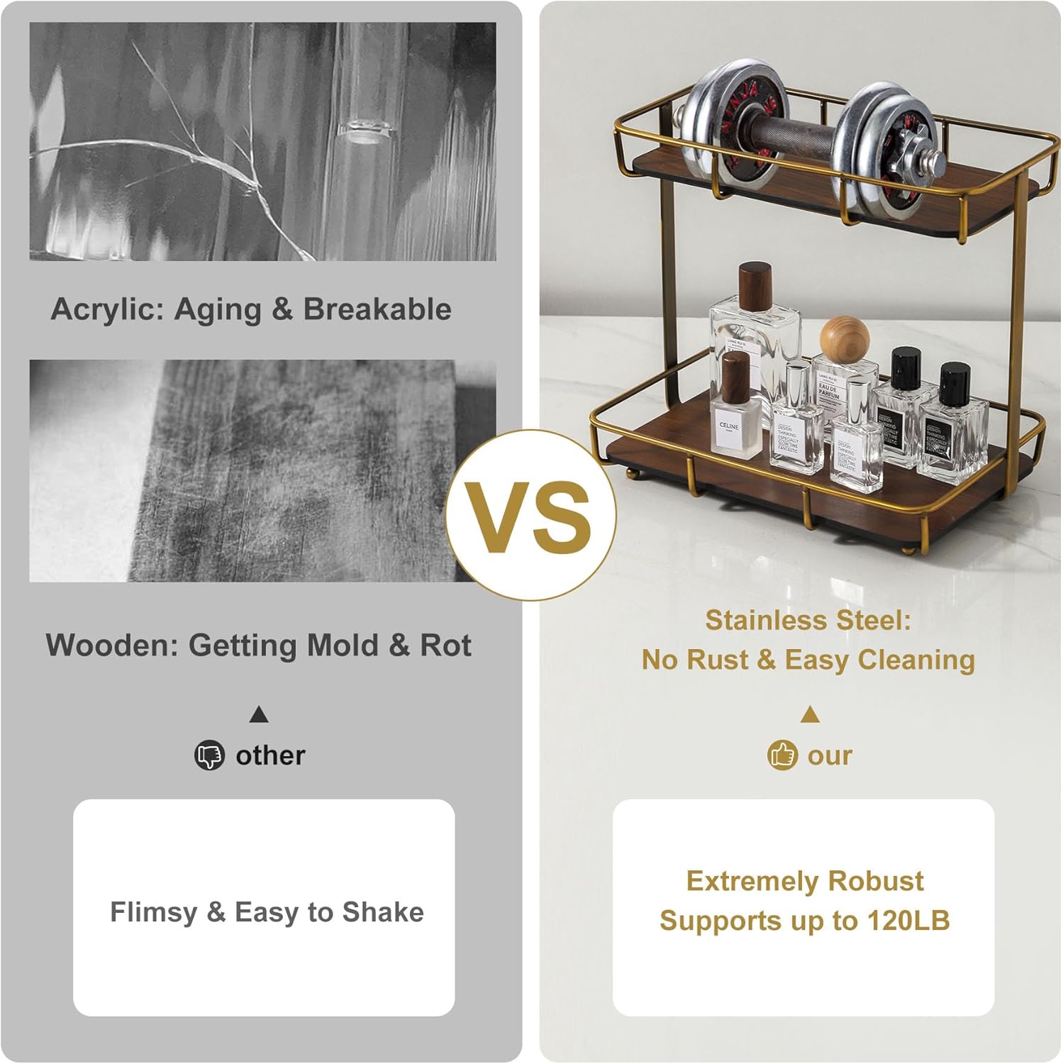 Bathroom Organizer Countertop Perfume Organizer Makeup Organizer Cosmetics Storage Display Rack Vanity Tray Dresser Stainless Steel Gold Shelf Wooden Tray