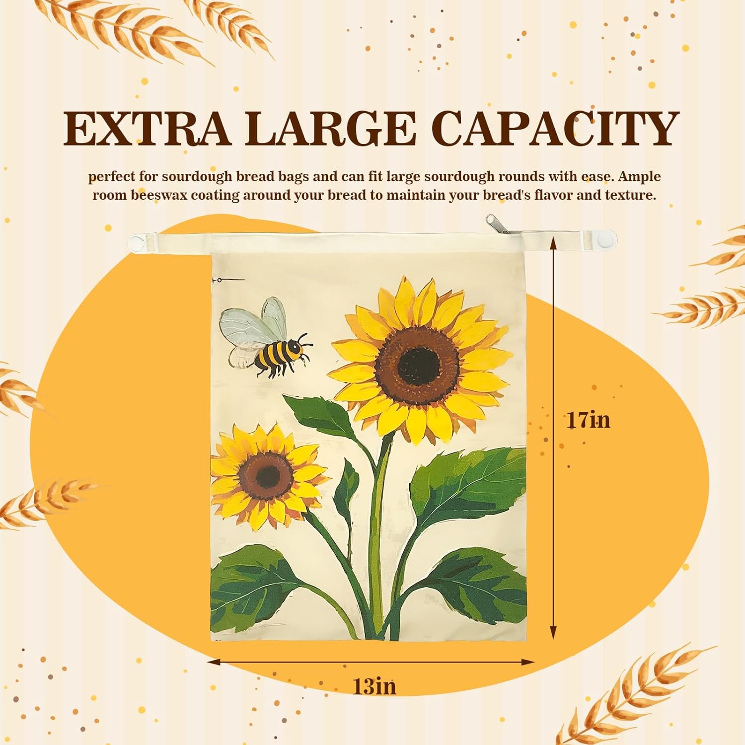 - Sunflower Pattern Multi-Purpose Clip: Unique printed sunflower pattern, comes with dual-function clip, clip can also be used as a handle for a picnic/bake fair. These beeswax bread bags can hold up to 4 lbs of sourdough bread balls and 16-inch French bread.