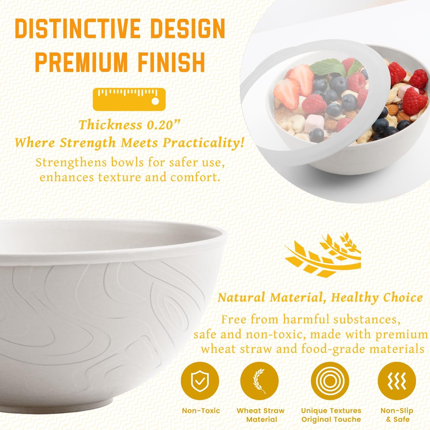 - PREMIUM WHEAT STRAW MATERIAL: Crafted from premium wheat straw fiber, this wheat straw bowls offers exceptional durability. The food-safe, non-toxic composition ensures daily use for families, with no harmful chemicals or lingering odors. Enjoy worry-free food storage for your family's daily meals, cereal, soup, salad, and leftovers
