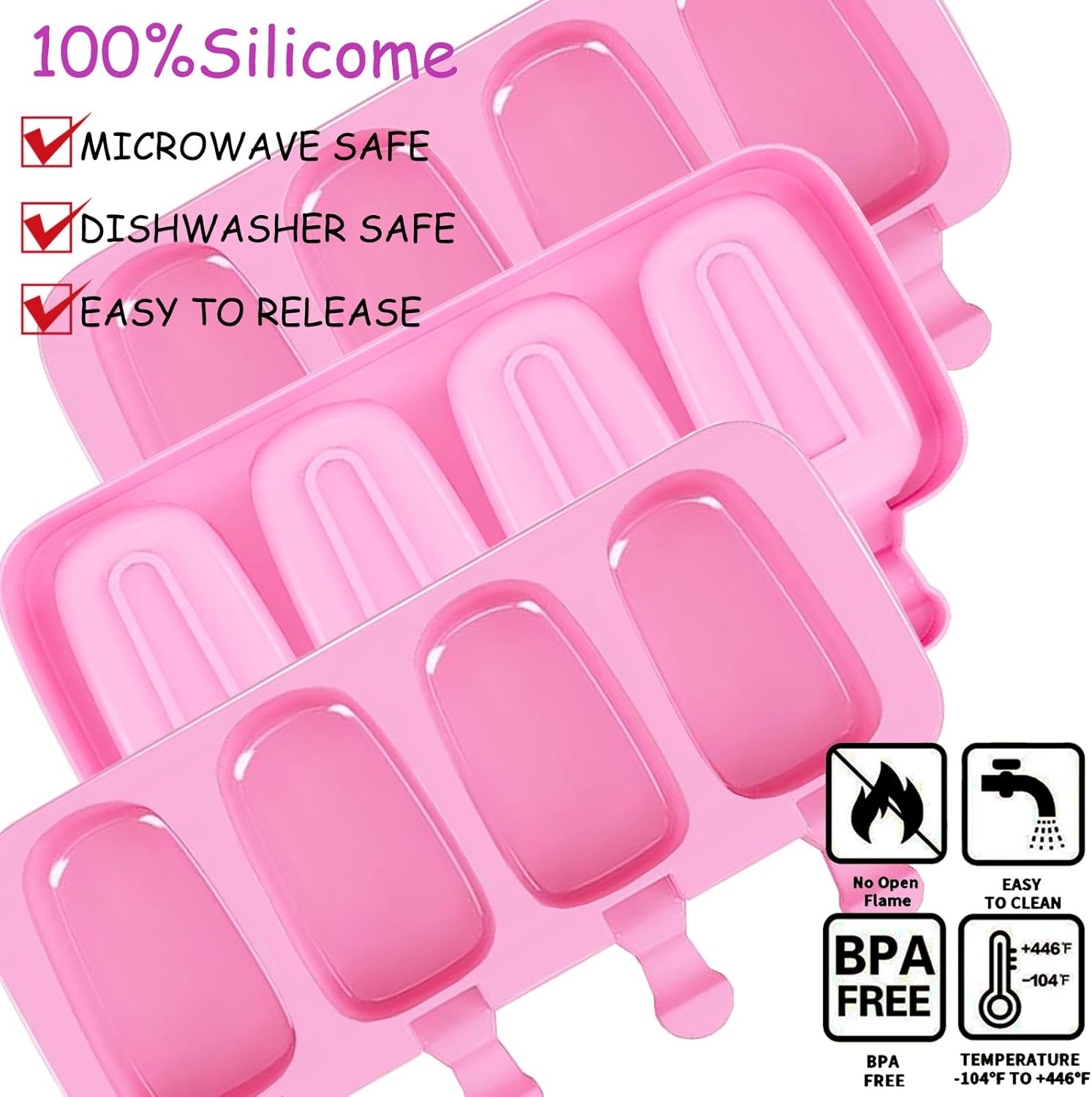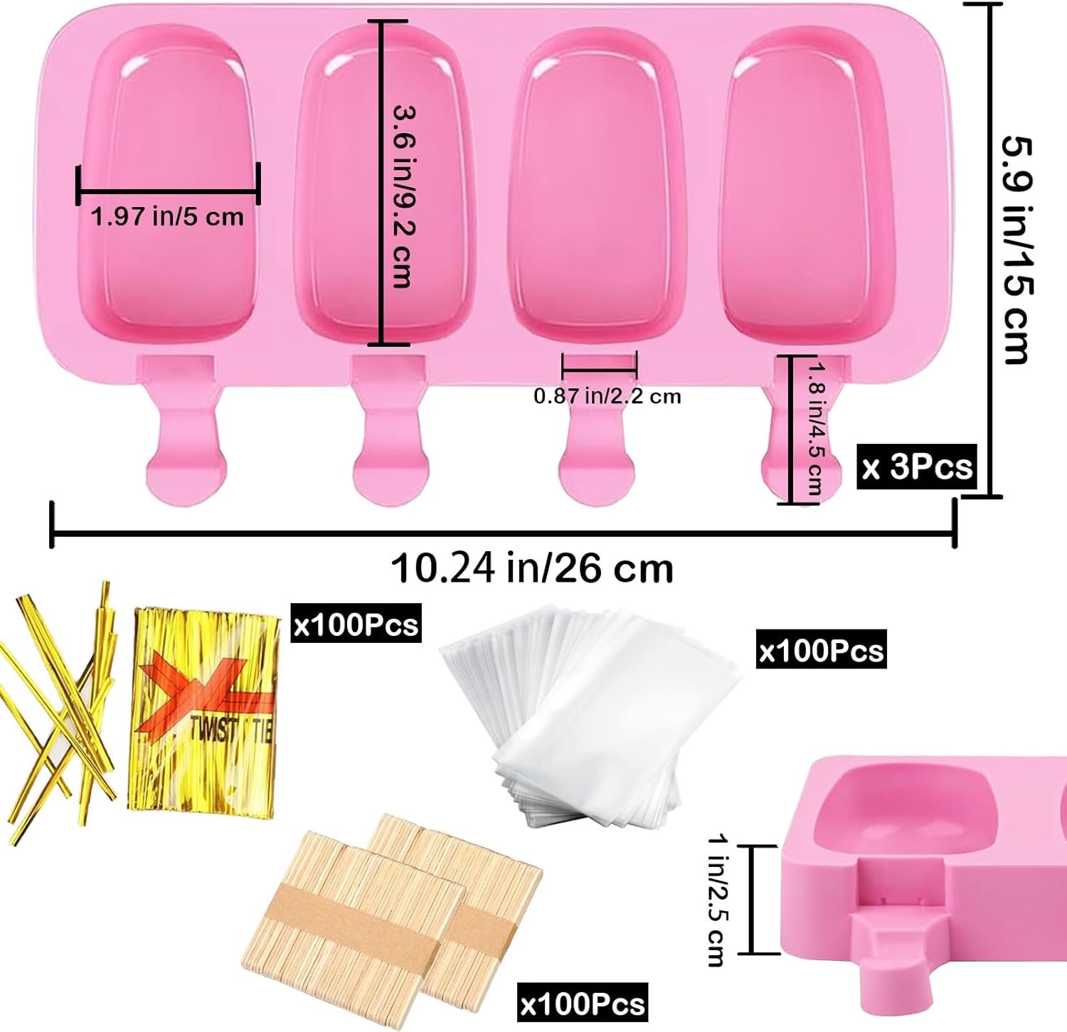 3pcs Large Silicone Popsicle Molds Set,BZIDII 4 Cavities Cake Pop Molds,Oval Ice Cream Bar Mold Ice Pop Cakesicle Molds Silicone with 100 Wooden Sticks & 100 Bags &100 Twist Ties(Pink)