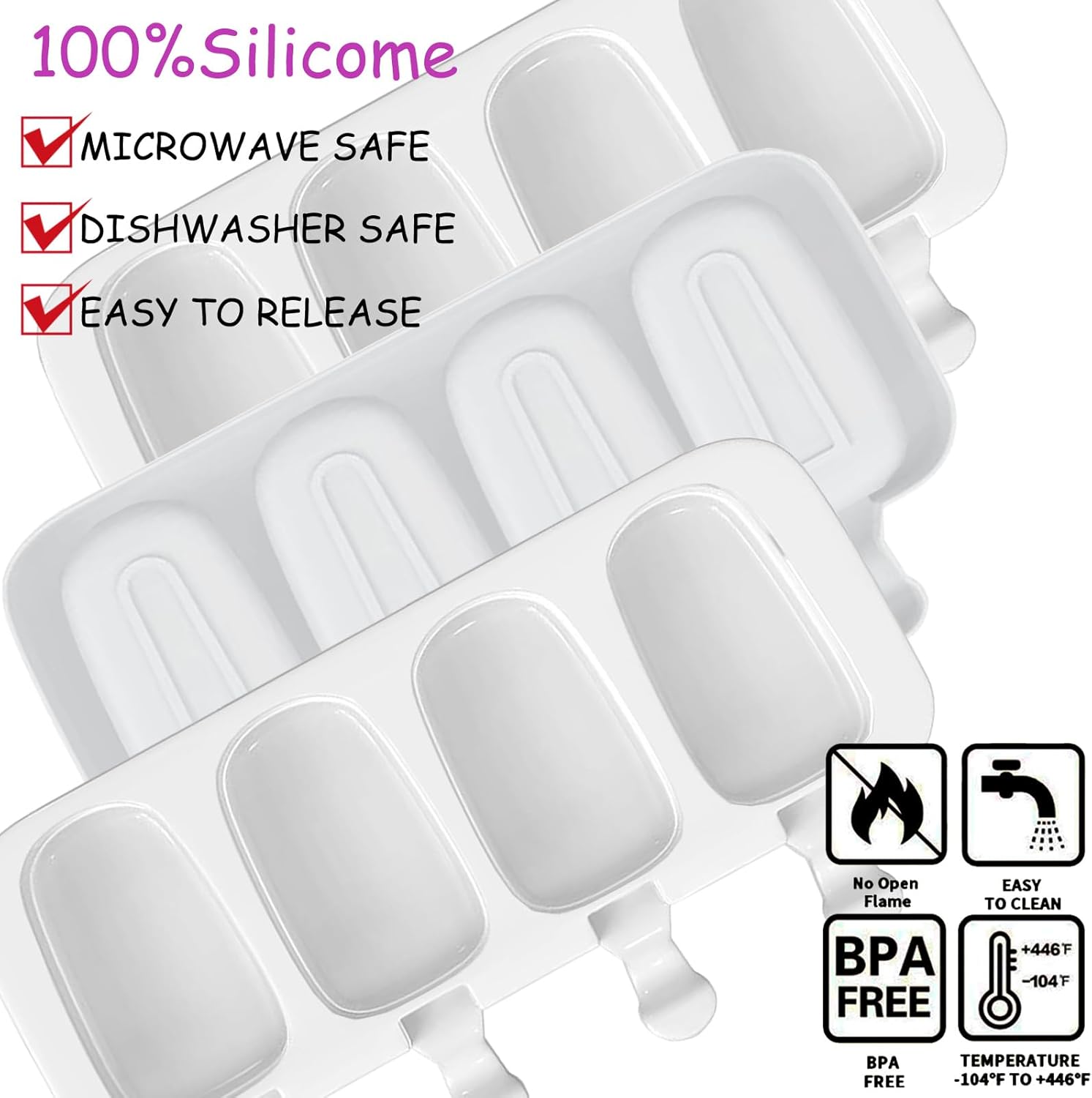 - 【Food-Grade Silicone】 These popsicle molds are made of high quality food-grade silicone. The silicone is soft and the surface of the mold is smooth. Silicone molds are designed to withstand both high and low temperatures ranging from -104 ℉ to +446 ℉(-40℃ to +230℃) .