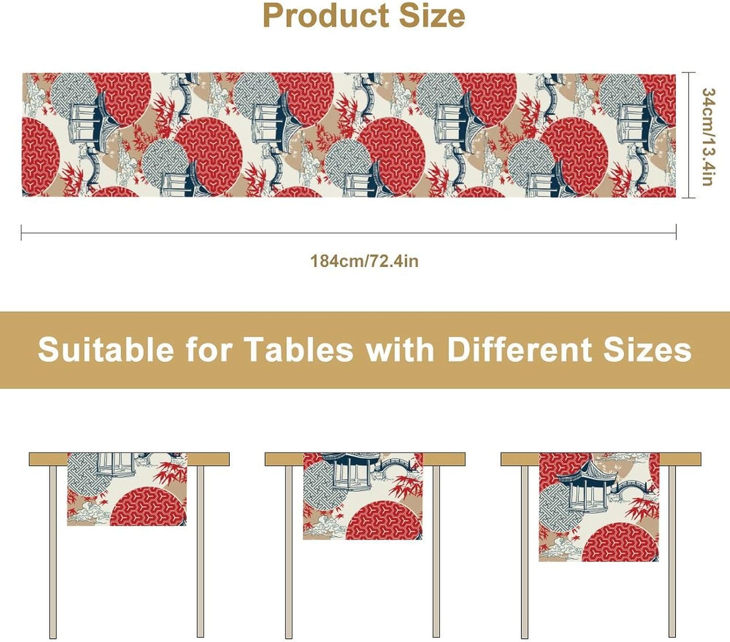 Asian Style Landscape Dinning Table Runner, Oriental Line Geometry Wave Traditional Elements Red White Table Runner for Kitchen Home Party Dinner Set, 13x60 Inch