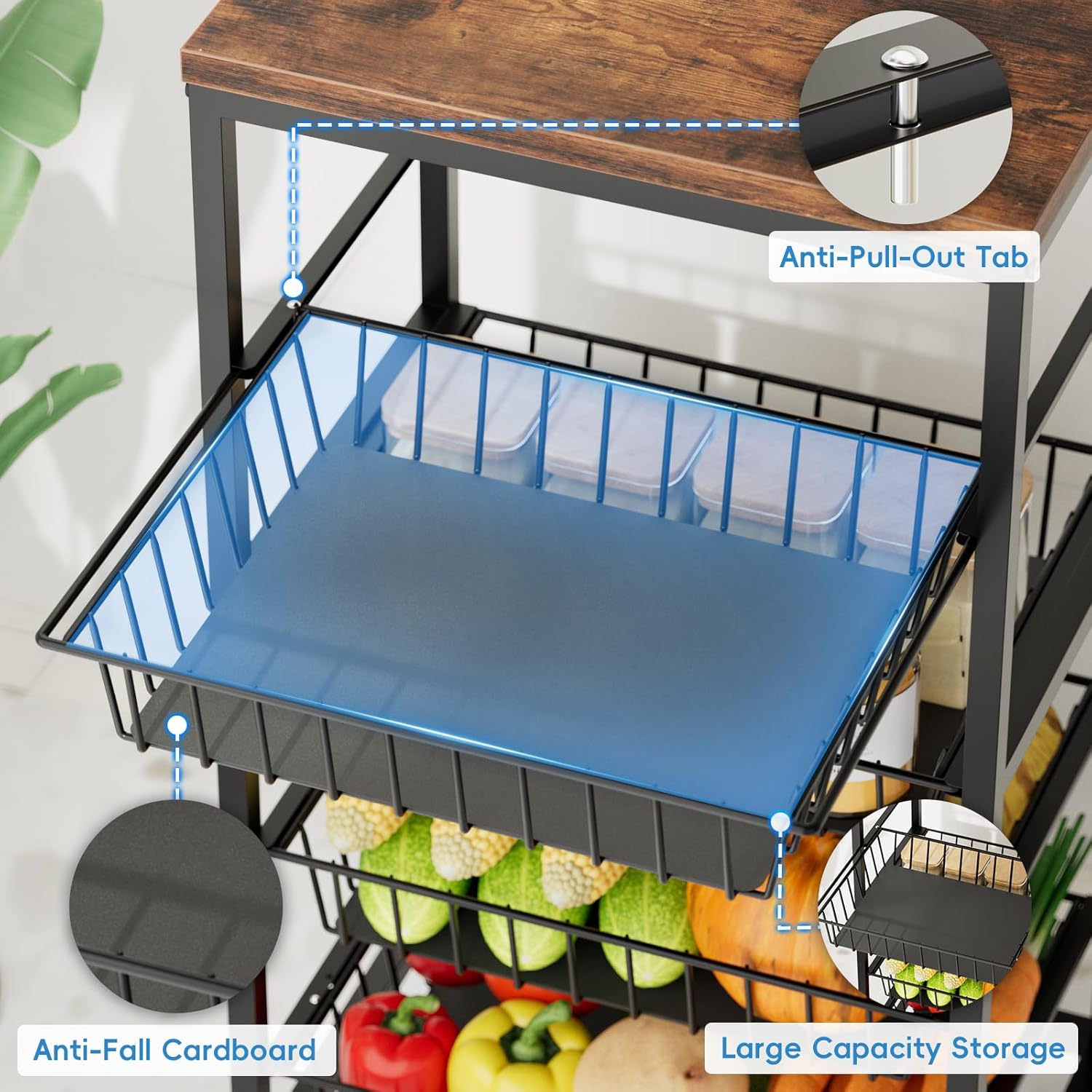 - 【Versatile Vegetable & Fruit Basket Cart】 This 4-tier vegetable basket cart doubles as a fruit basket stand and pantry cart. Organize produce, snacks, and kitchen essentials with pull-out baskets for easy access. The wooden top adds counter space while keeping potatoes, onions, and appliances within reach - perfect as kitchen storage cart for homes with limited space.