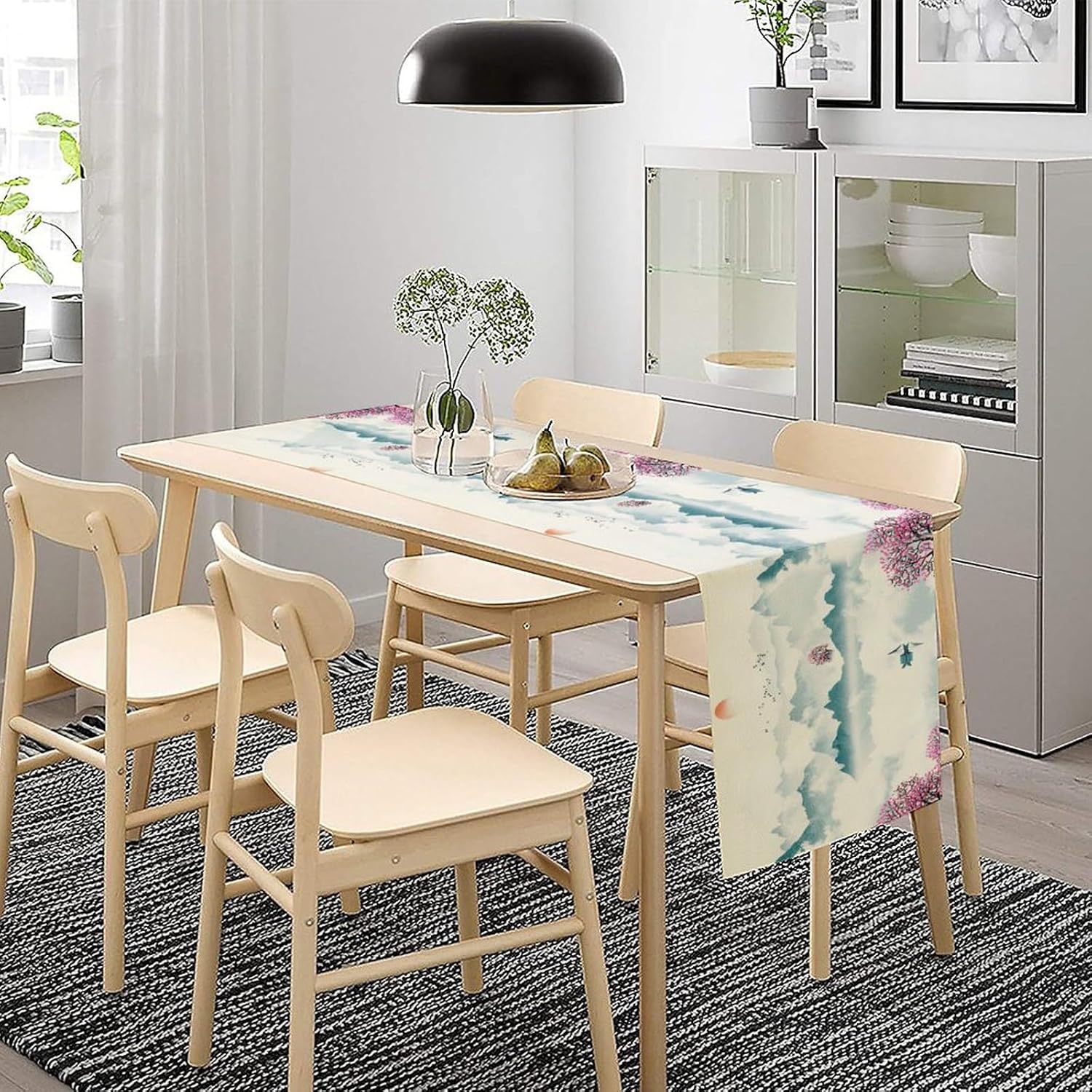 Asian Landscape Table Runner, Cherry Tree Chinoiserie Vintage Ink Wash Pink Blue Setting Sun Table Runner for Kitchen Home Party Dining Table Decor 13x120 Inch