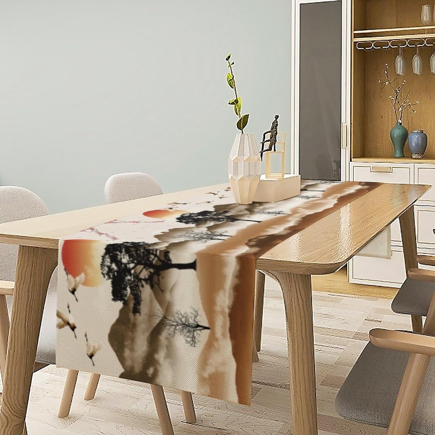 Asian Table Runner, Bamboo Ancient Chinese Paintings Table Cover Cloth for Kitchen Dining Bedroom Red Crowned Crane Landscape Ink Painting Sunset 13x108 Inch