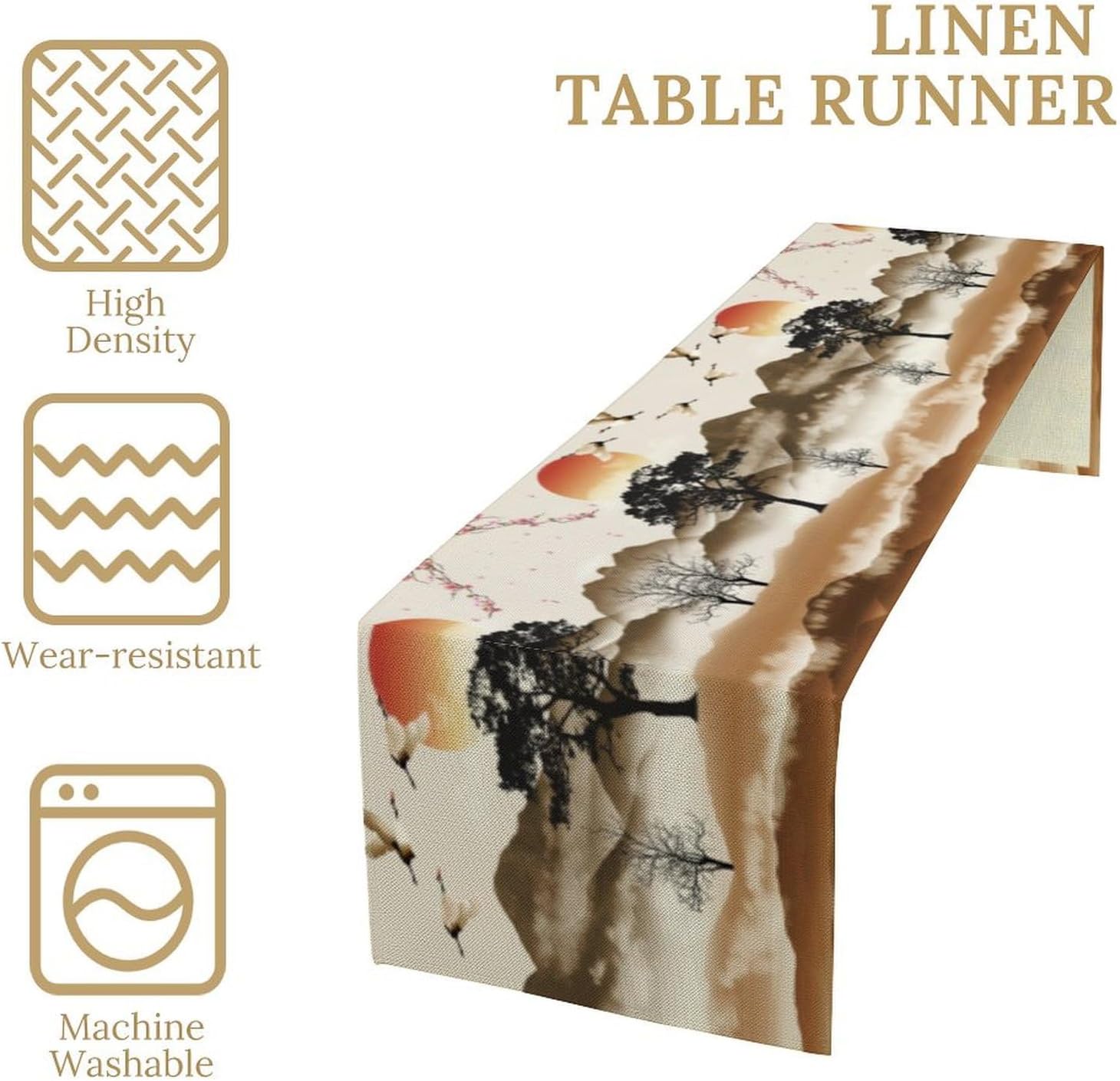 Asian Table Runner, Bamboo Ancient Chinese Paintings Table Cover Cloth for Kitchen Dining Bedroom Red Crowned Crane Landscape Ink Painting Sunset 13x36 Inch