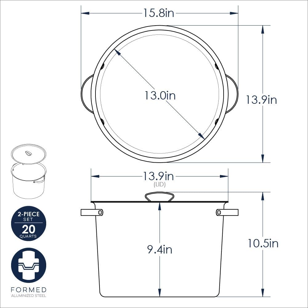 - This 20 quart stock pot with lid is perfect for soups, stews, seafood boils and more. Detailed pot measurements are listed on the drawing image but the interior is 13 inches in diameter and 9.4 inches in height.