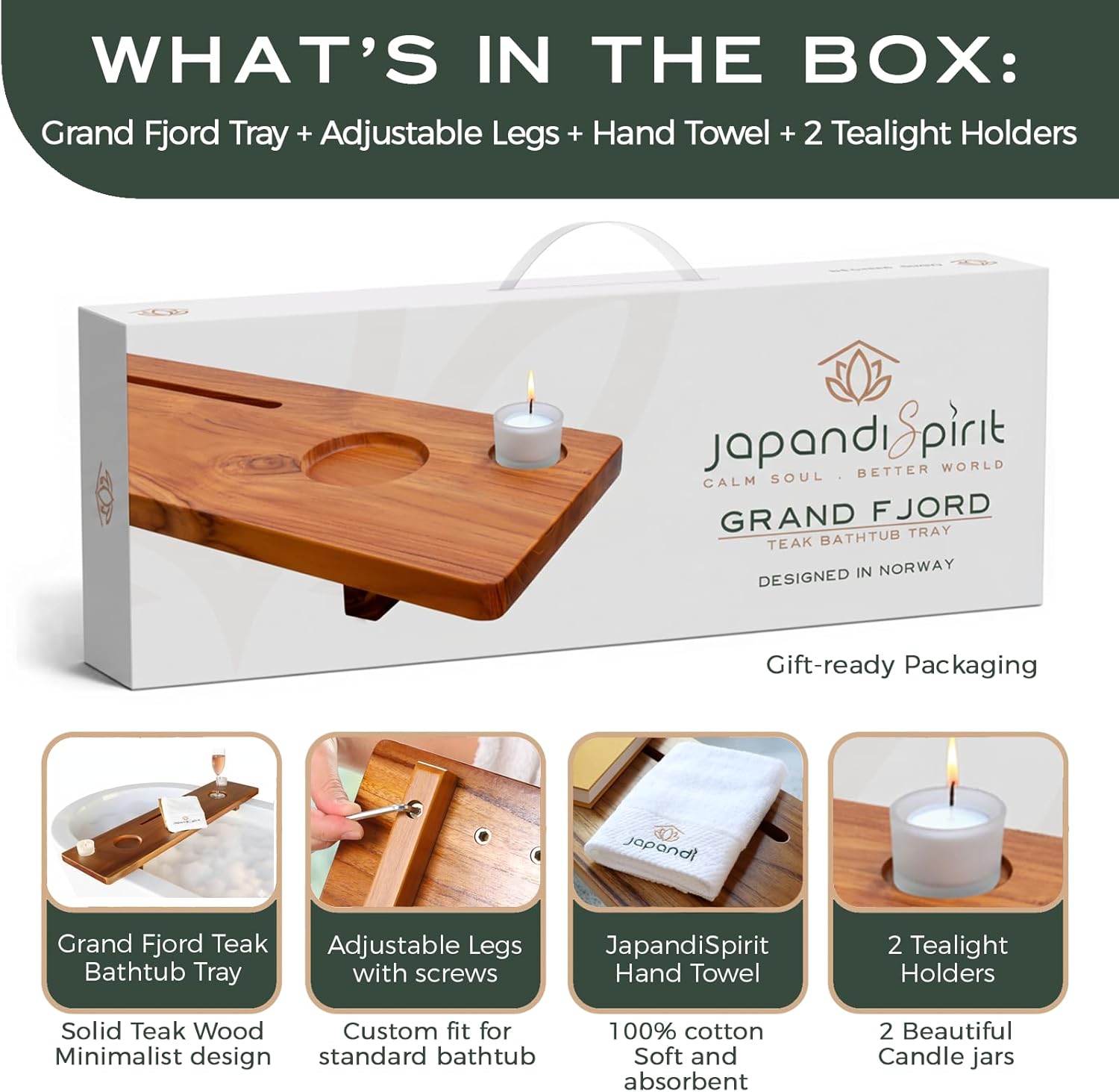 Grand Fjord | Teak Bathtub Tray for Large Soaking Tub | Extra Long 35” Luxury Bath Caddy for Freestanding Tubs | Minimalist Wooden Tub Tray with Candle Holders & Premium Towel by JapandiSpirit