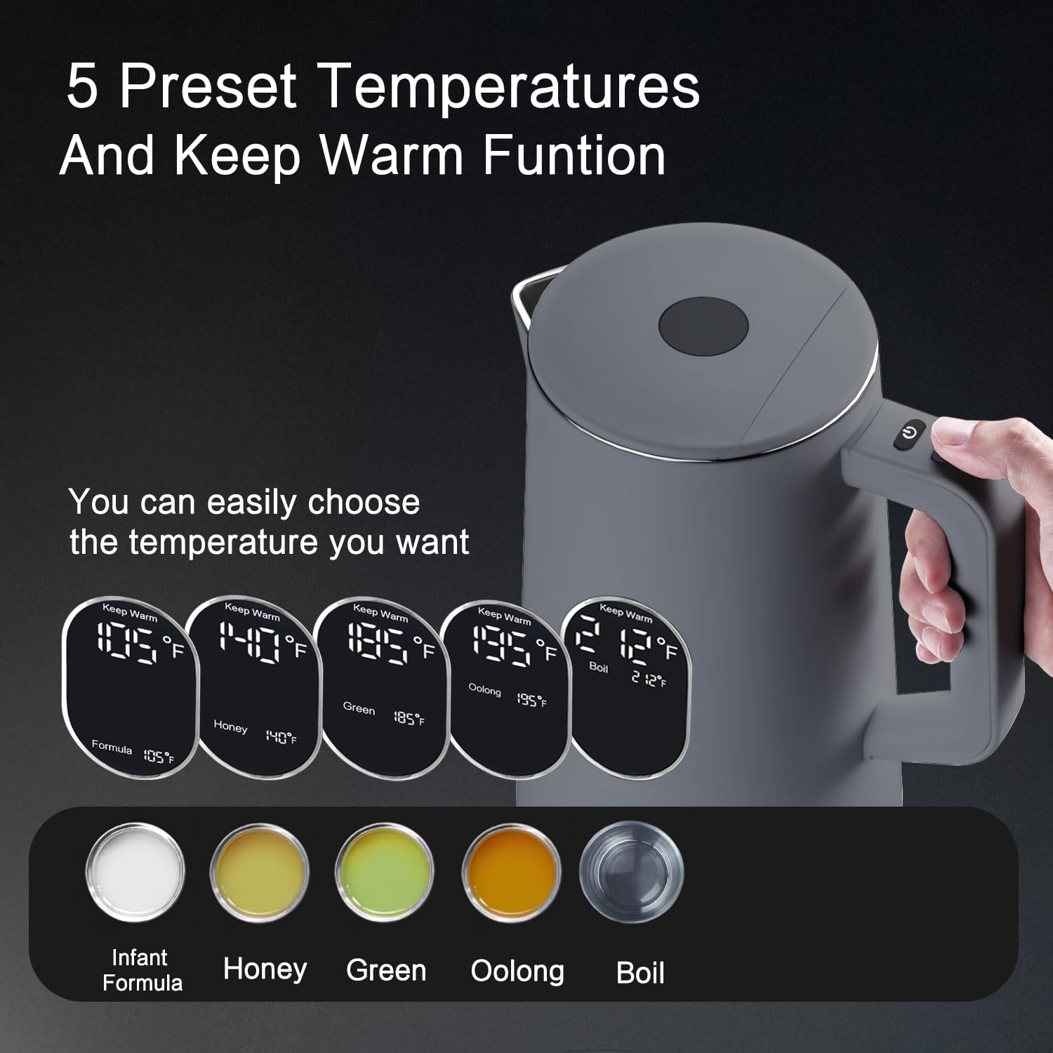 1.5L Electric Kettle Stainless Steel, Double Wall Cool Touch Teapot, Fast Boil,5 Temperature Control, LED Display, Auto Shut-Off, BPA-Free,Keep Warm Function, Ideal for Tea & Coffee,Gray