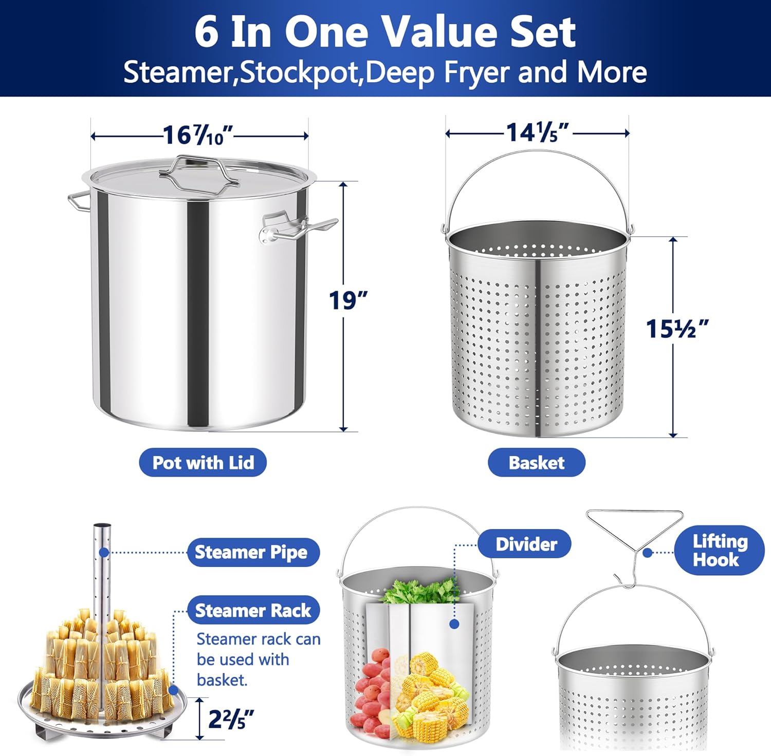 - 【Premium 8-Piece Stainless Steel Set for Heavy-Duty Cooking】This complete cooking set includes the 64qt pot, lid, straining basket, steamer insert rack, divider, steamer pipe, lift hook, and a 48" mixing paddle. Crafted from premium stainless steel, it's built to last a lifetime, outperforming and outlasting ordinary aluminum pots.