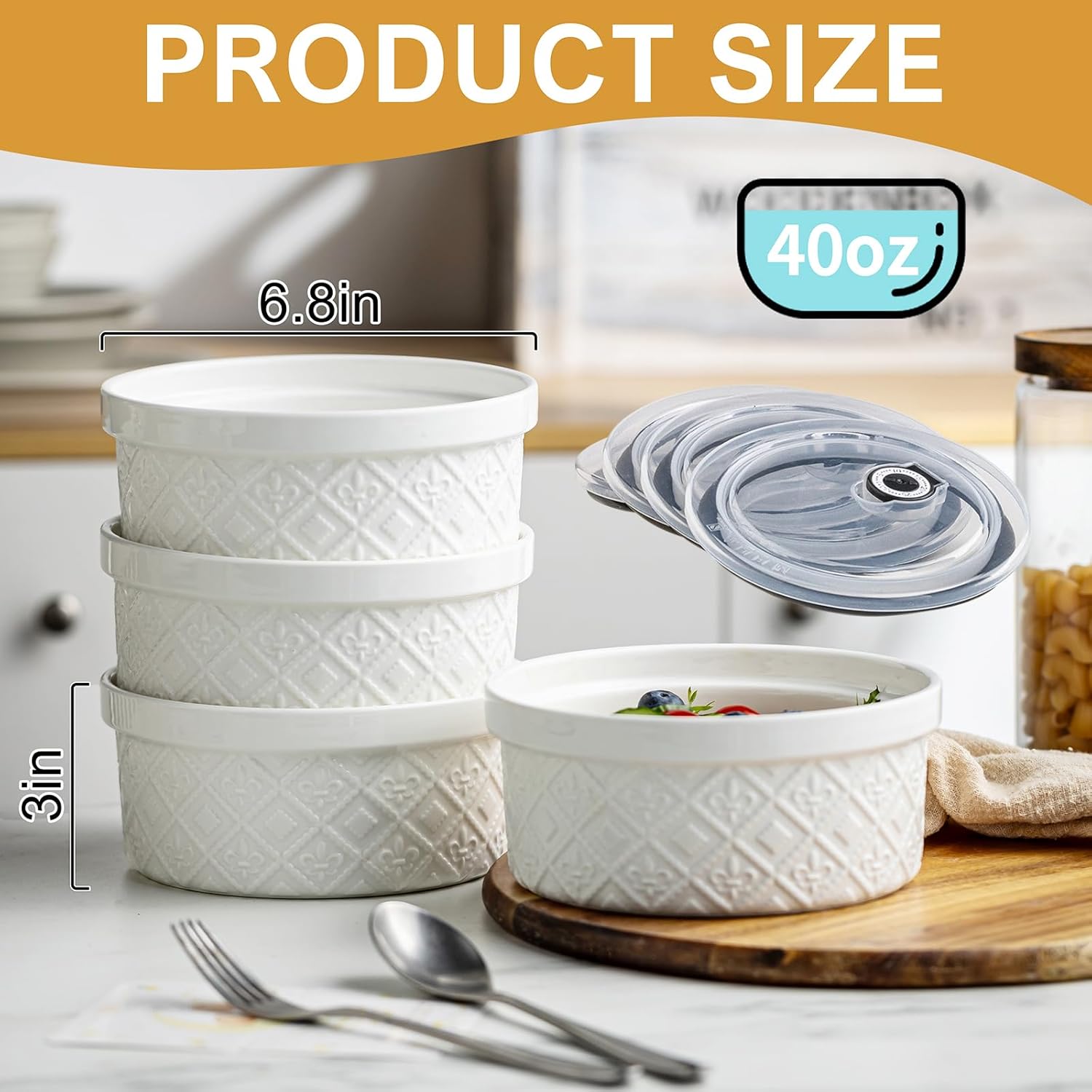 - Durable & Space-Saving: Crafted from high-quality ceramic, these lidded large soup bowls withstand chipping, extreme temperatures, and daily wear. Their stackable design cuts cabinet space by 70%. The vintage beige finish with delicate embossed patterns blends seamlessly with any kitchen decor, merging practicality with timeless charm