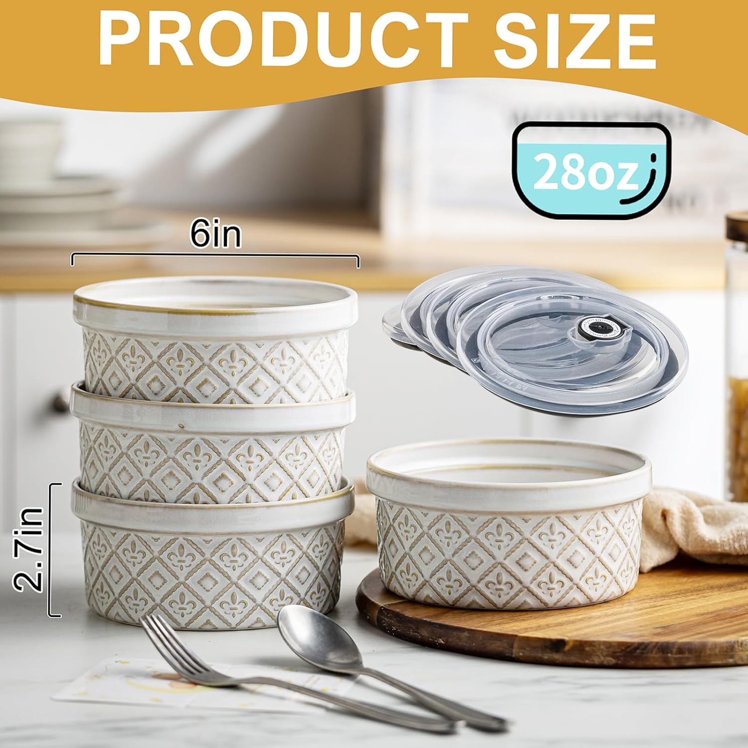 28 Oz Cereal Bowls Set with Lids, Ceramic Salad Bowls for Kitchen, Preparing, Camping, Office Lunch, 6 Inch Kitchen Food Storage Containers with Airtight Lids set of 4, Housewarming Present, Beige