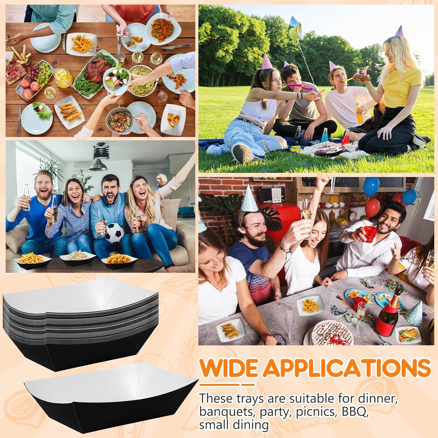 - Broad Applicability: our paper food trays are suitable for picnics, camping most indoor and outdoor events, such as birthday parties, weddings, dinner parties, carnivals, tea parties, holidays, barbecues, restaurants, concession stands, food trucks, stadiums, theaters and more; They will make your party table setting look attractive and impressive