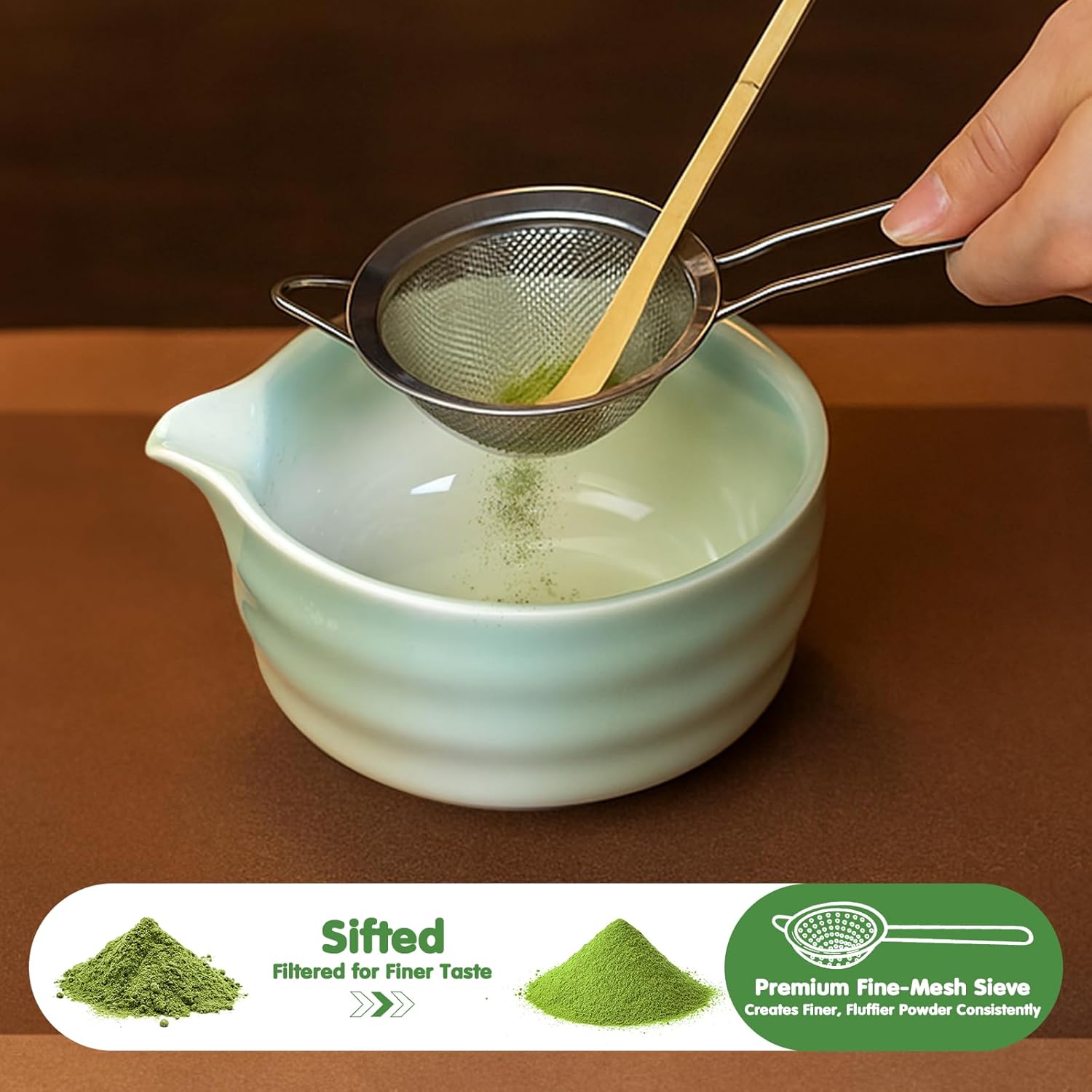 - 7 Pcs Matcha Tool Set:Matcha kit includes 510ml ceramic matcha bowl, bamboo matcha whisk, matcha scoop, stainless steel sifter, holder and tea towel. All the essentials for preparing perfect matcha in one curated set.