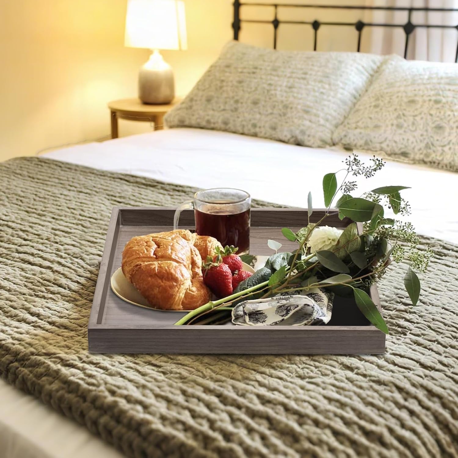 - 【Square Storage Tray 】From serving meals and drinks to organizing everyday items like keys, mail, and remotes, this wood serving tray effortlessly adapts to various tasks, streamlining your daily routines with its versatile functionality. It can be placed on a footstool, coffee table, bed, sofa, chair, living room, bay window, etc., to provide beverages and snacks to keep everything organized.