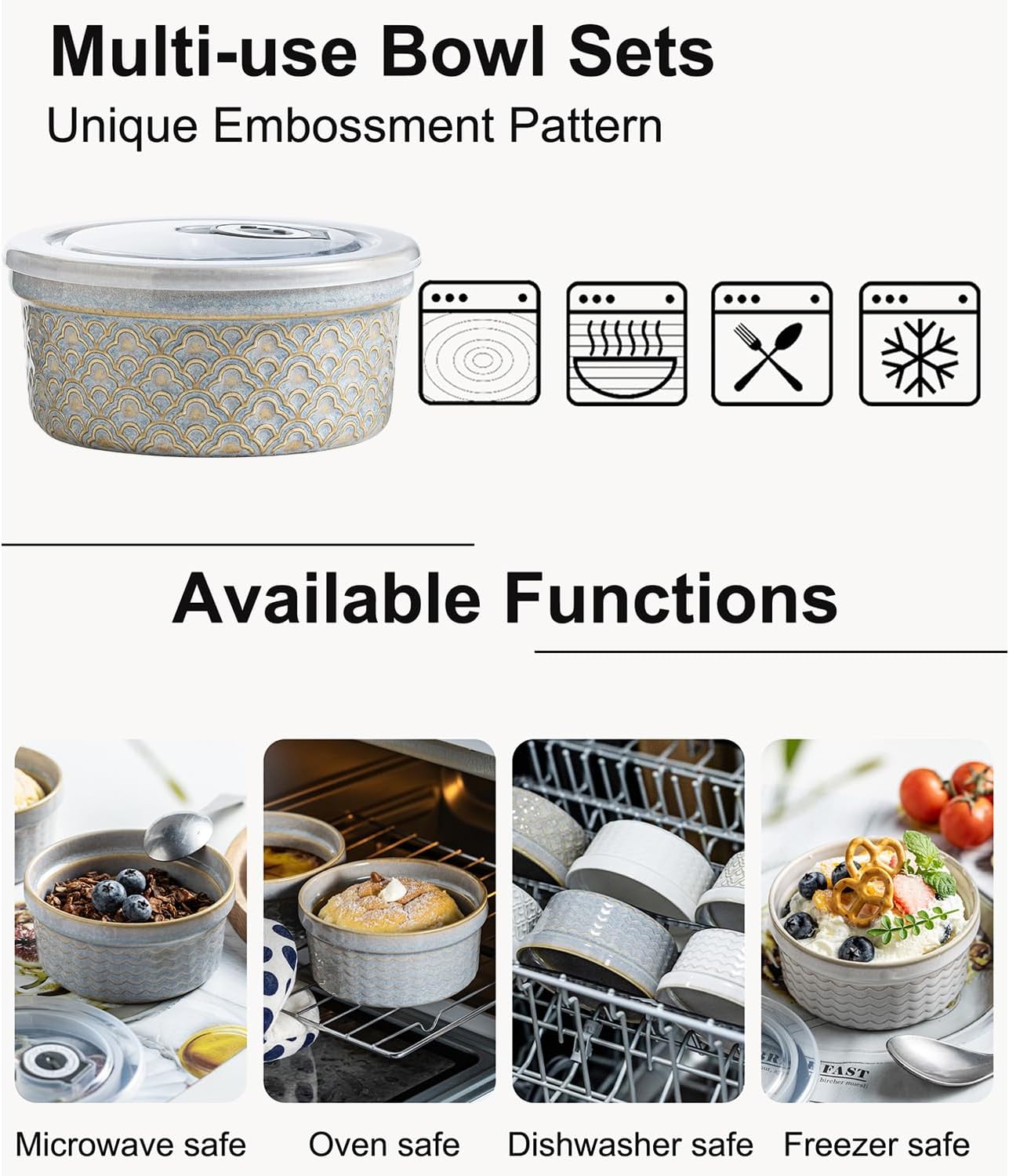 - Versatile Food Storage Containers with Covers: With their handy lids, these ceramic oven-safe bowls with lids offer versatility in the kitchen. Use them to bake individual portions of crème brûlée, soufflé, or custards, and then easily cover and store any leftovers. The lids also help keep your food fresh and protected when transporting or storing. With lids, ramekins become highly portable. You can easily take them on picnics, to work for a personal treat, or to potlucks without worrying about spills or contamination
