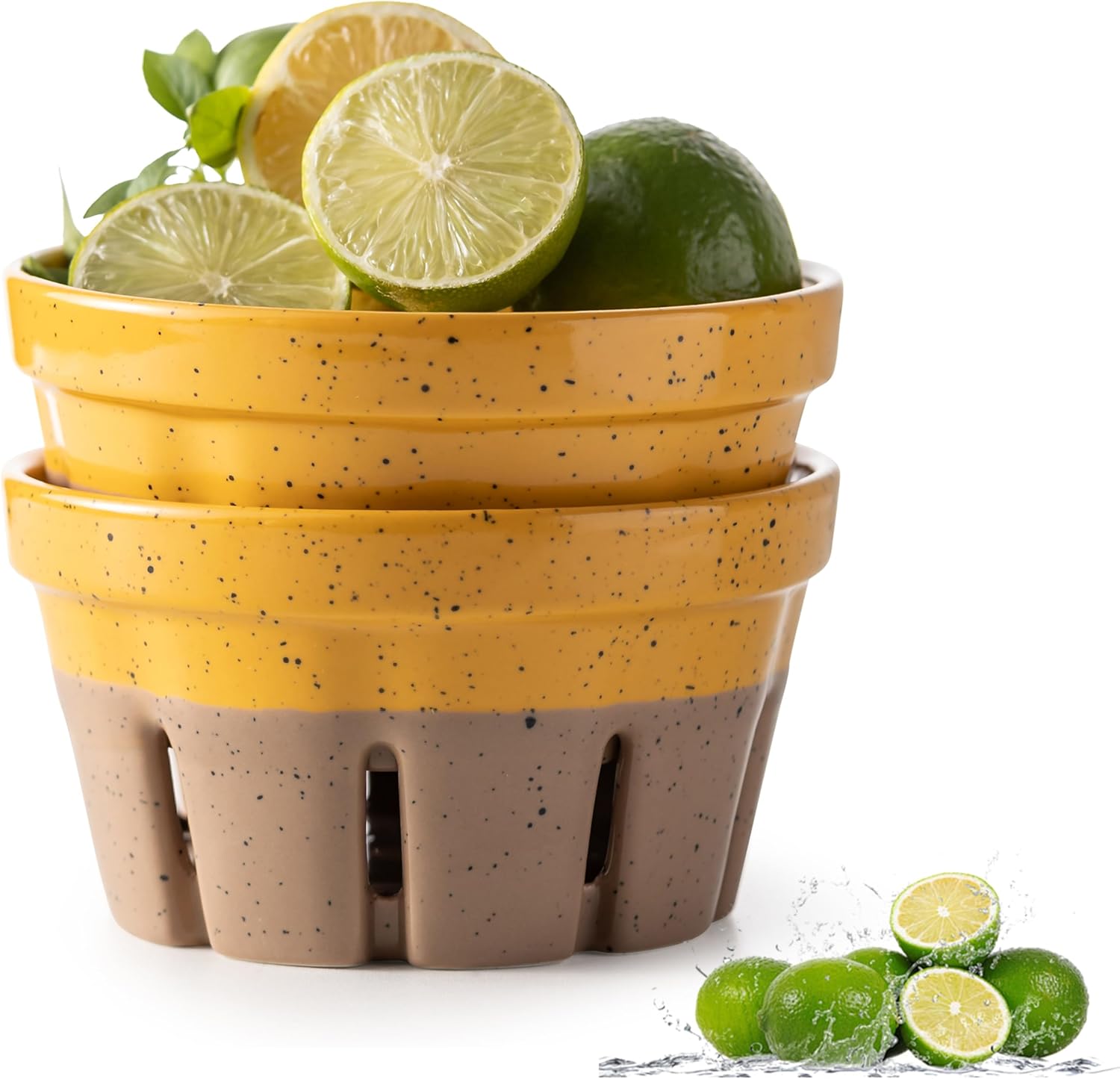 Gomakren Fruit Bowl with Holes, Ceramic Berry Basket Set of 2, 5.8 Inch Round Fruit Storage Containers, Strawberry Baskets, Farmhouse Kitchen Decor, Yellow + Brown
