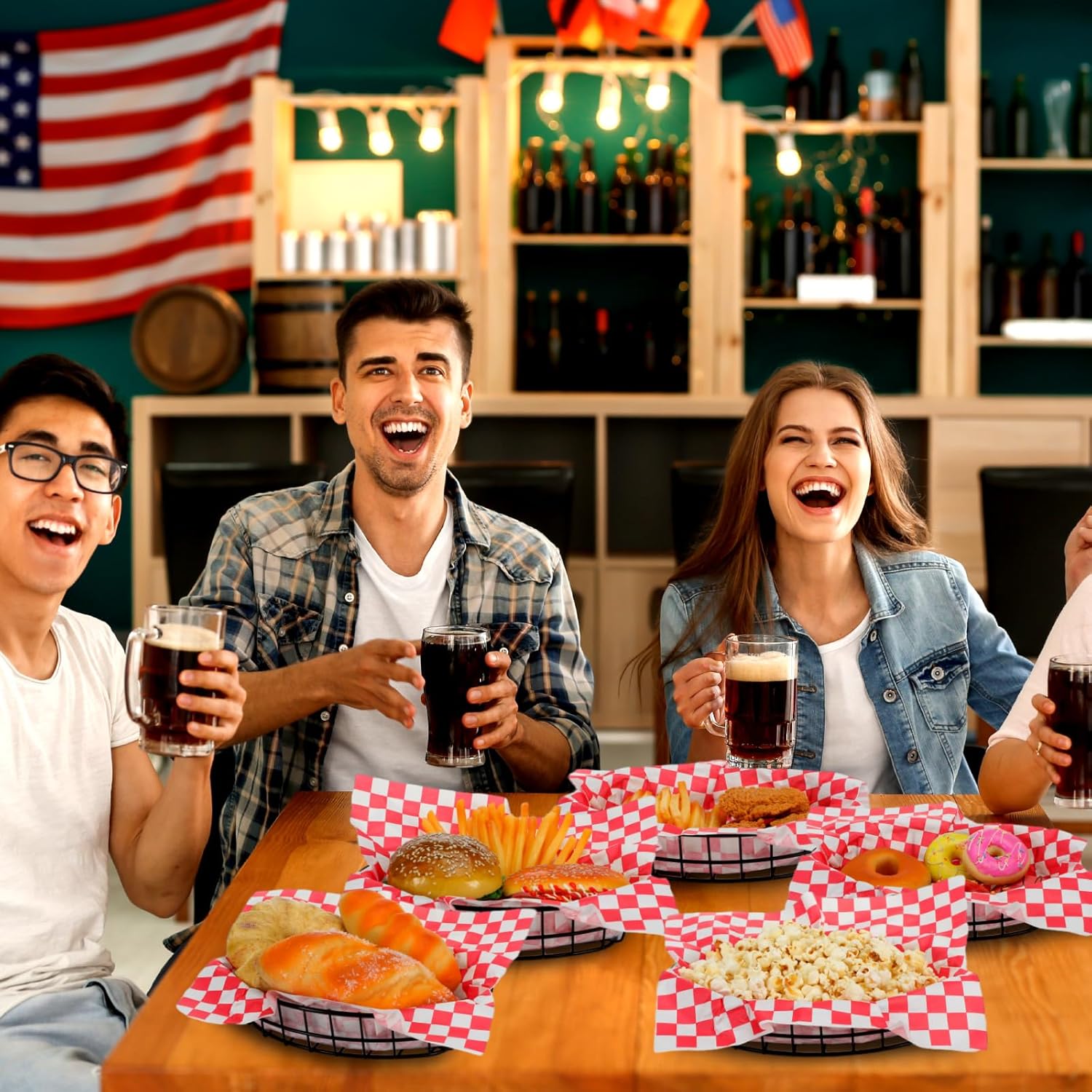 Hushee 12 Pcs Wire Bread Basket 9.5x6.2x2.2 Inch Halloween Candy Basket Oval Metal Dinner Roll Baskets for Serving Fruit Bowl with 50 Deli Wrapper Paper for Kitchen Fast Food(Black,Red White Plaid)