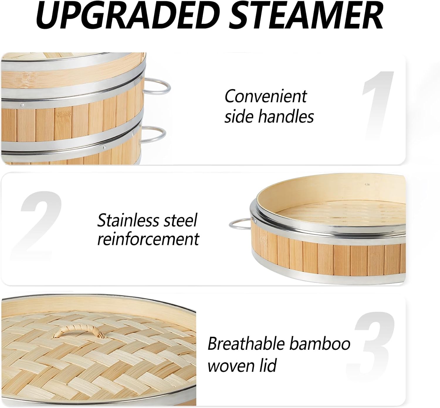 MacaRio Bamboo Steamer Basket Set 10 inch Dumpling Steamer for Cooking with Stainless Steel Reinforcement Side Handles Ring Adapter Dumpling Cutter & Press Liners for Dim Sum Dumplings Buns Seafoods Vegetables Rice