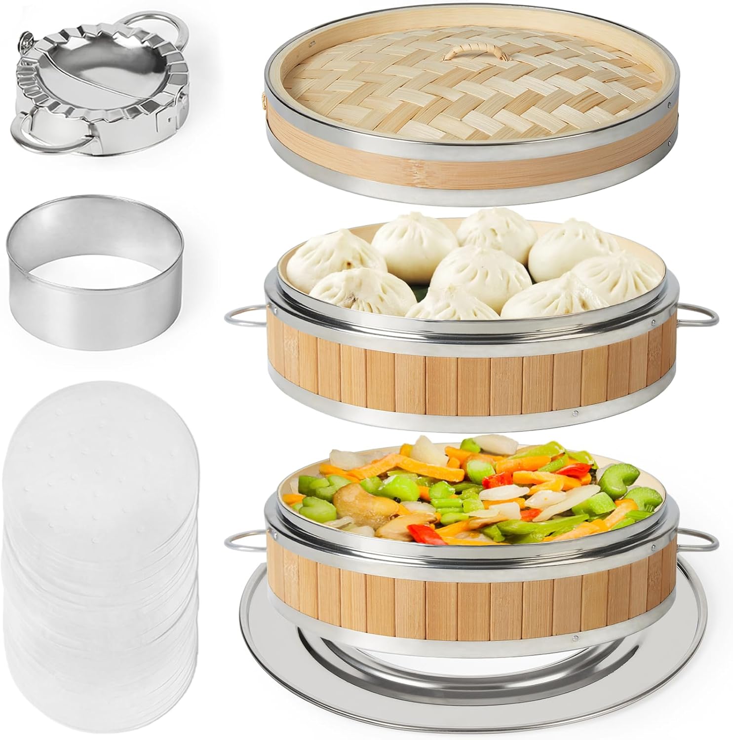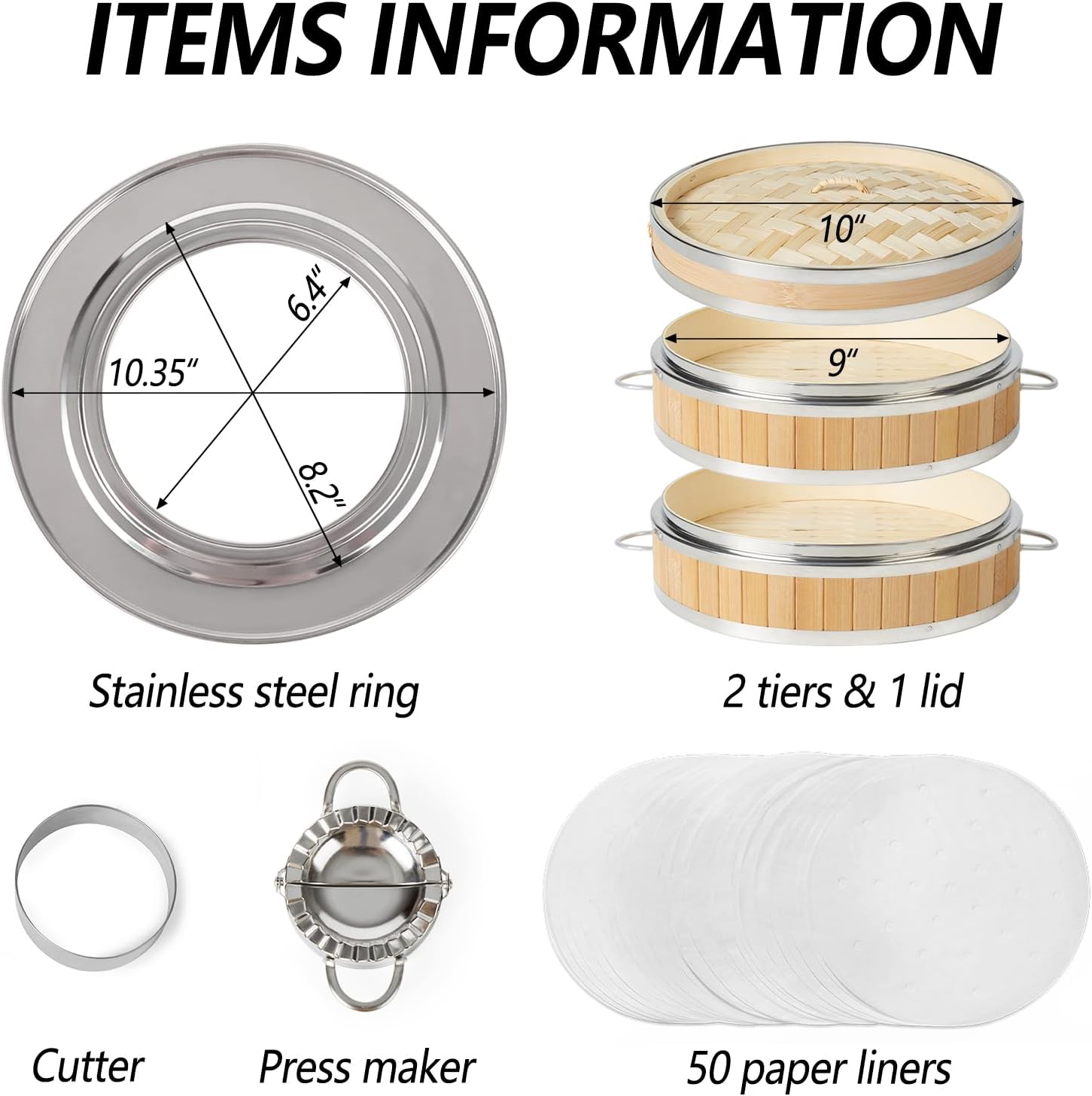 - Bamboo Steamer Set: Two tier baskets with a domed lid, one stainless steel ring adapter, one stainless steel dumpling skin cutter, one stainless steel dumpling press maker, and fifty paper liners