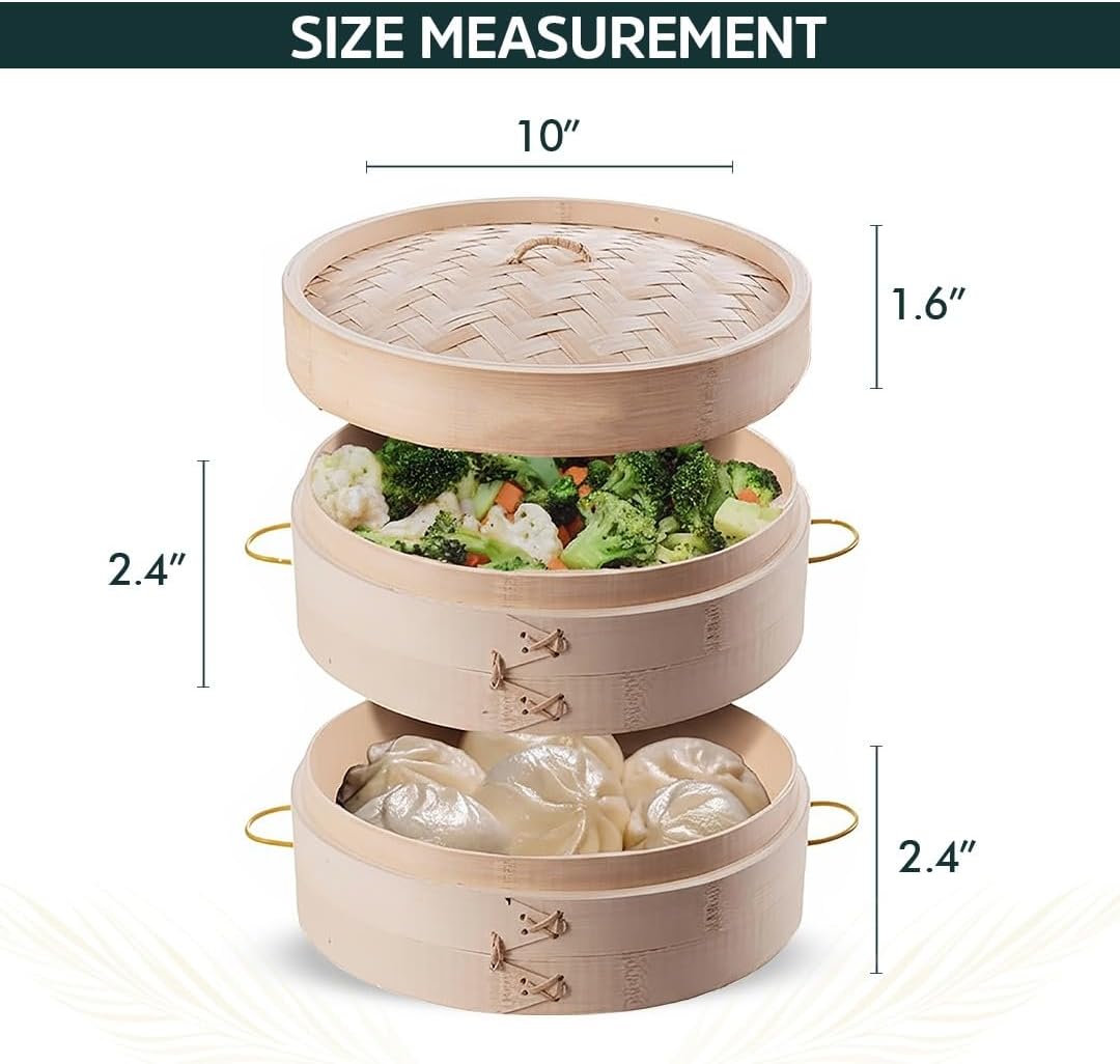 - Fast & Healthy Steaming Steam multiple foods simultaneously with this 10-inch, two-tier bamboo steamer. Ideal for dumplings, vegetables, or fish, it preserves natural flavor and nutrients while saving time. Enjoy effortless, energy-free healthy cooking every day