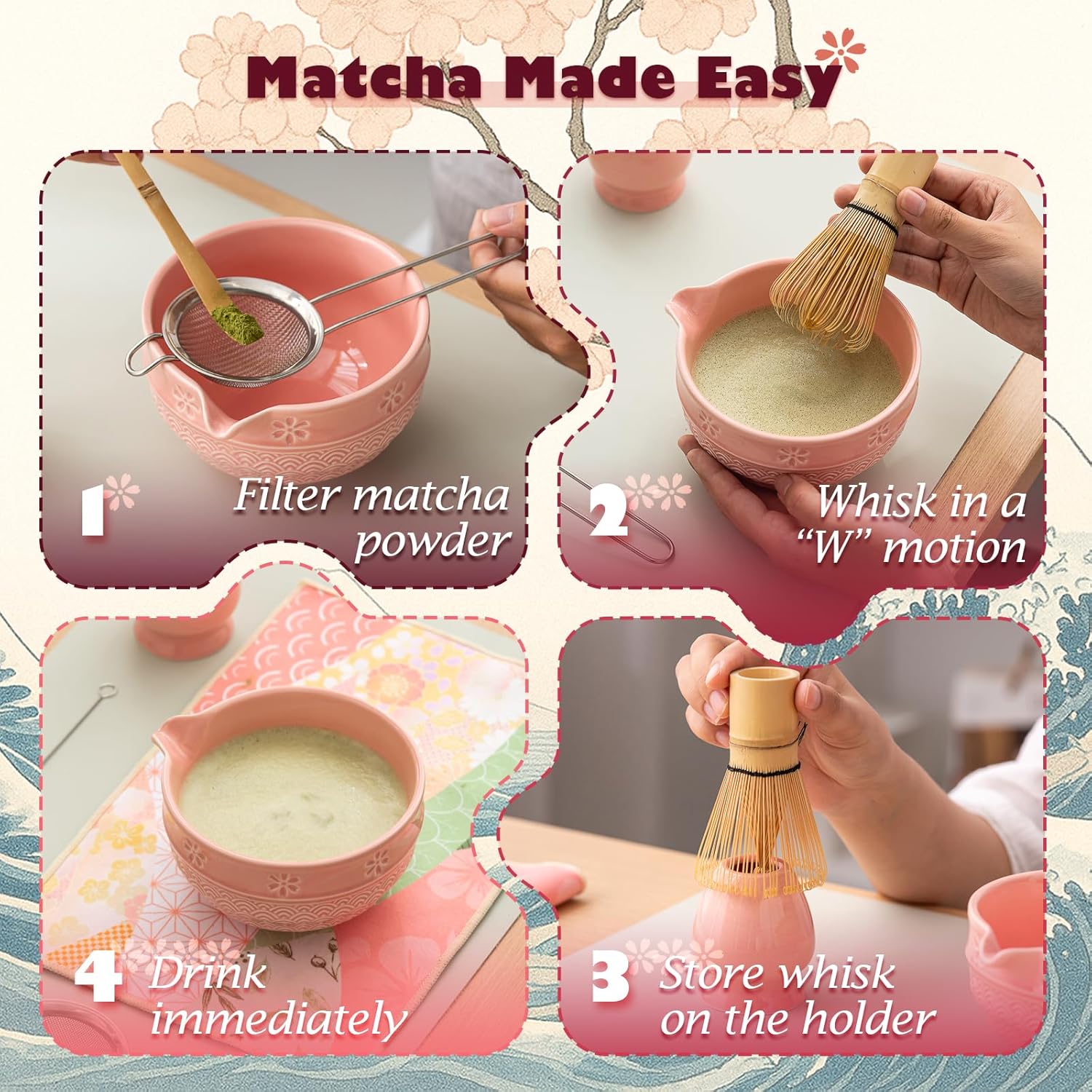- Complete 8 Pcs Matcha Set :Includes 1* 500 ml 16.9 oz ceramic matcha bowl, 1* bamboo matcha whisk chasen, 1* whisk holder, 1* bamboo scoop chashaku, 1* flower scoop rest, 1* stainless steel sifter, 1* tea towel, and 1* cleaning brush, everything you need for an authentic tea ritual.