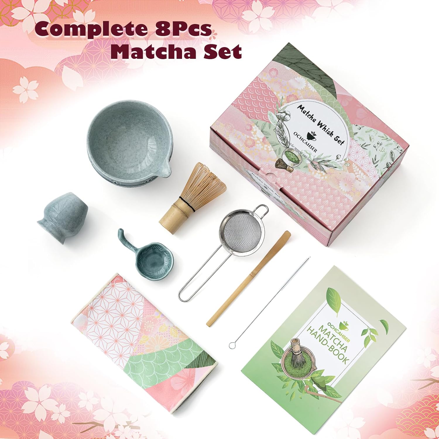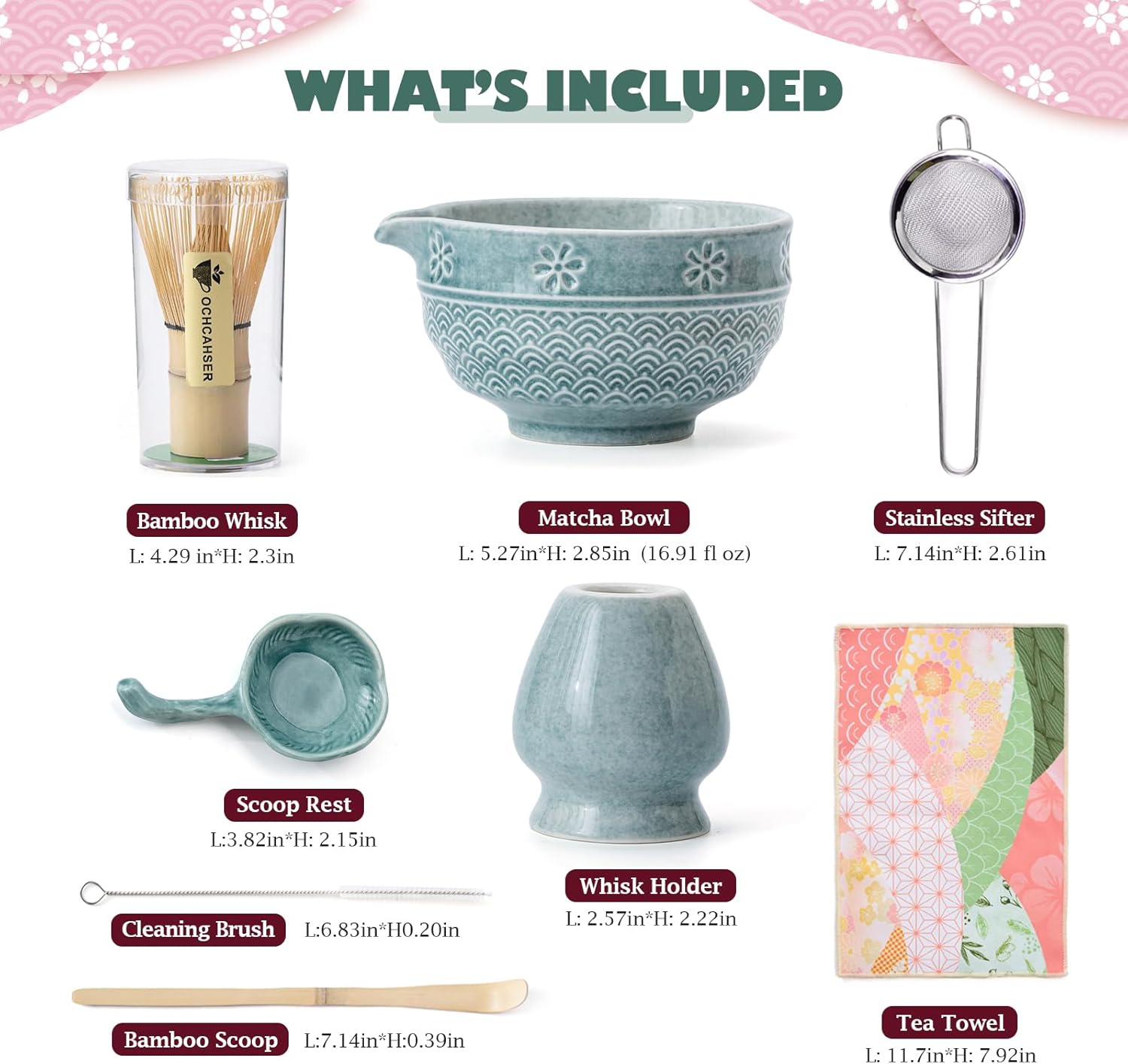 - Complete 8 Pcs Matcha Set :Includes 1* 500 ml 16.9 oz ceramic matcha bowl, 1* bamboo matcha whisk chasen, 1* whisk holder, 1* bamboo scoop chashaku, 1* flower scoop rest, 1* stainless steel sifter, 1* tea towel, and 1* cleaning brush, everything you need for an authentic tea ritual.