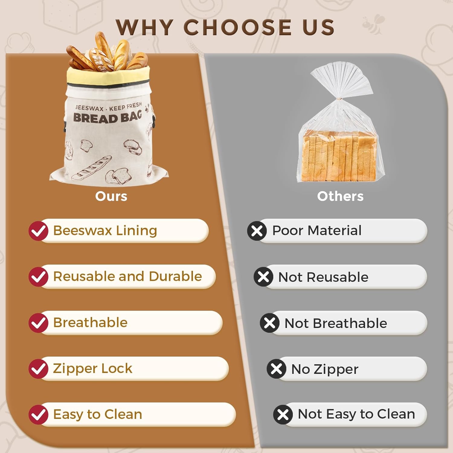 - 【Beeswax Lining Keeps Bread Fresh Longer】The natural beeswax-lined interior forms a breathable, food-safe barrier that locks in moisture—preserving softness, crust, and flavor. Safer than plastic, better than paper, it keeps sourdough, loaves, and sandwiches bakery-fresh for days. Ideal for anyone who values clean, natural storage.