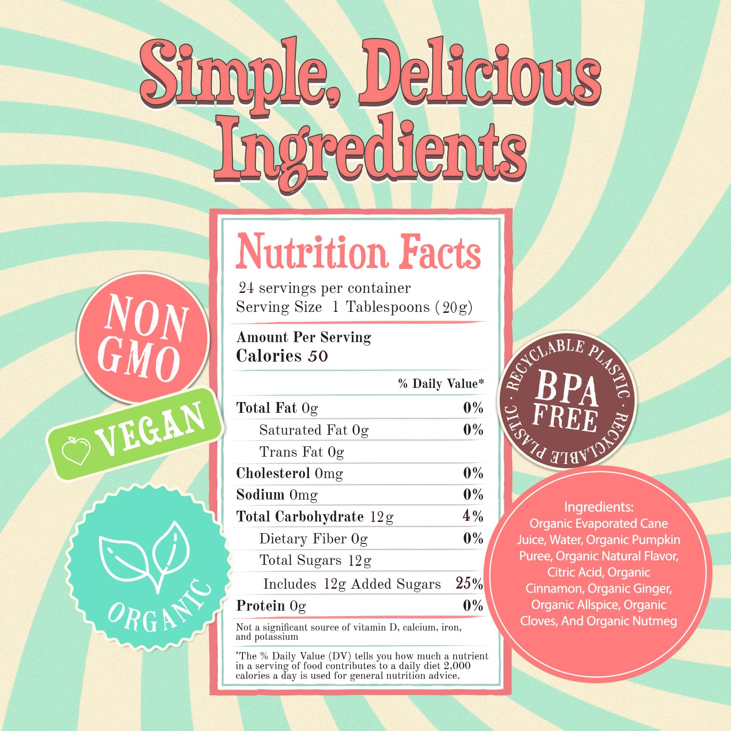 - Clean & Organic Pumpkin Spice Syrup – Vegan, non-GMO, and gluten-free organic syrup that never compromises on taste. Our rich pumpkin spice syrup is crafted with real organic pumpkin and a warming blend of seasonal spices, making it the perfect choice for those who care about clean ingredients without giving up flavor.
