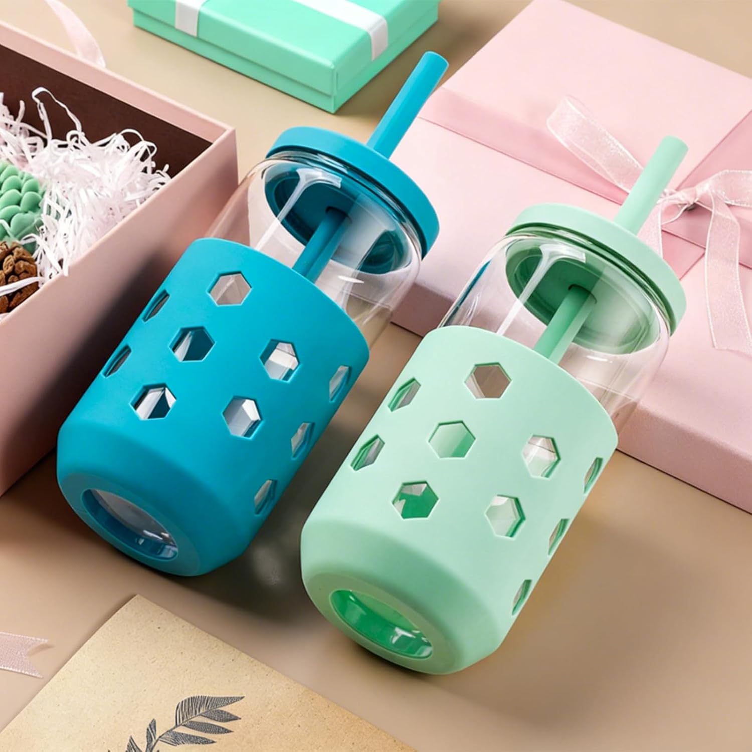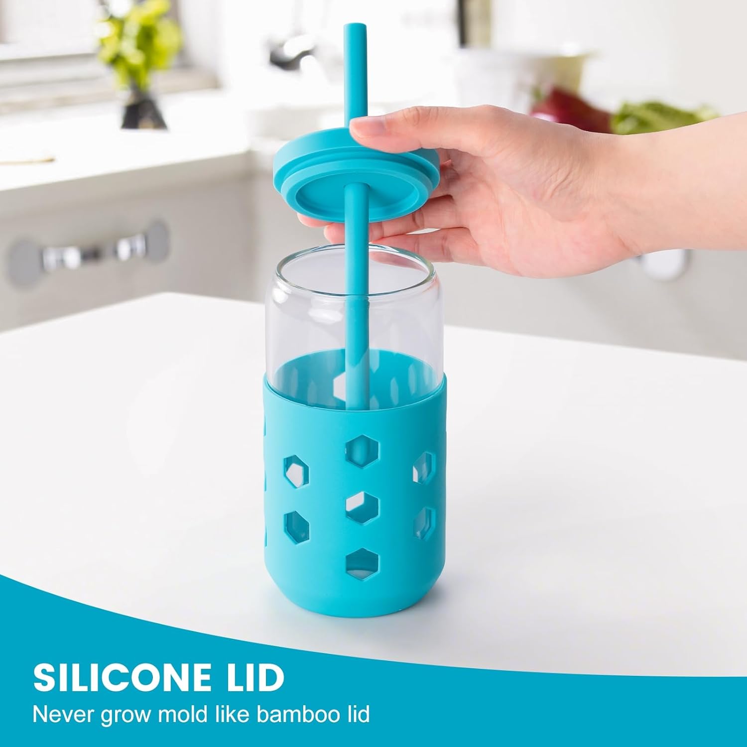 - Drinking Glasses Set of 4: Glass cups set includes 4 glass coffee cups with silicone sleeves, 4 silicone lids, 4 silicone straws, very practical cute glass cups set for kitchen and dining.