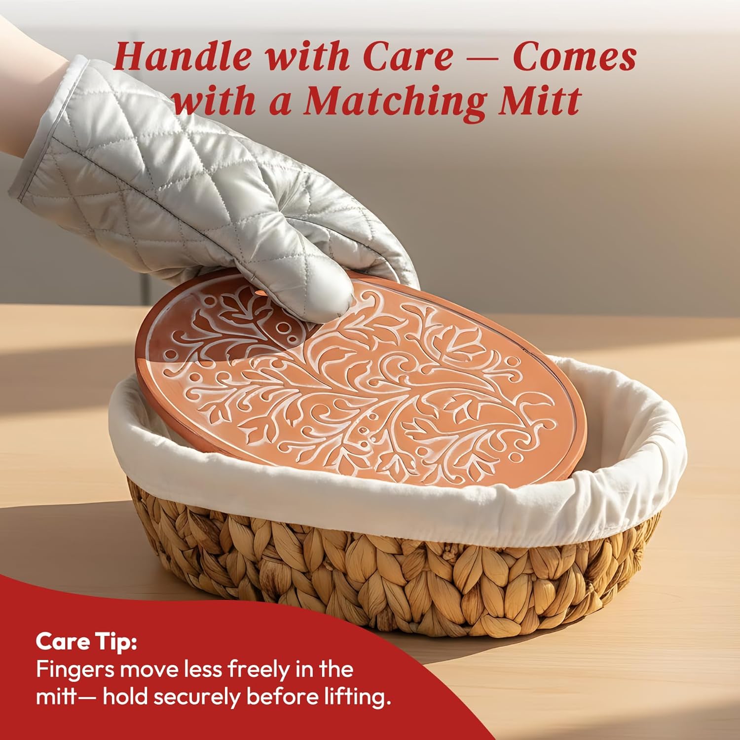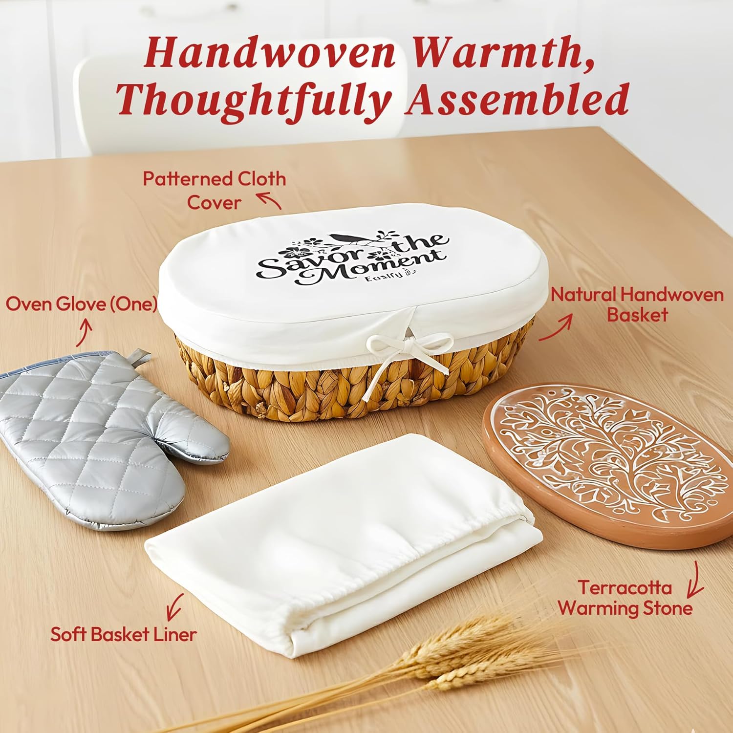 - 【Complete Set, Simple to Use】Beyond the bread basket and warmer stone, this set comes with a durable oven glove for safe handling, a soft basket liner, and a patterned cloth cover—ready to use right out of the box. Heat the stone at 350°F for 15–20 minutes, transfer with the glove, wrap your bread, and serve warm. A convenient all-in-one solution that makes serving warm bread effortless!