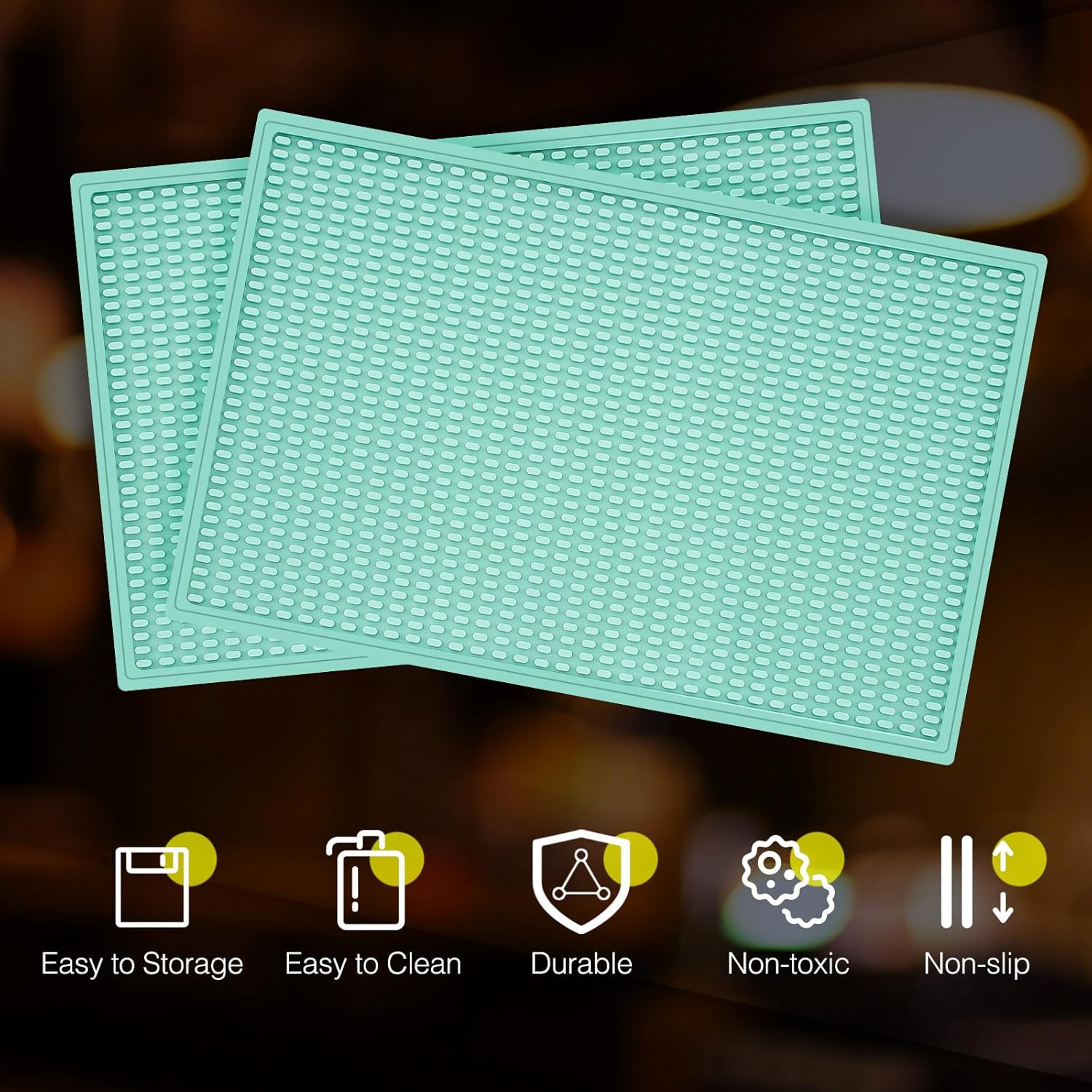 - Celebrate the Season with Green Bar Mat:our vibrant green bar mats are the nice item of your holiday festivities; Imagine a stunning, spill proof foundation for your Christmas cocktail station, protecting your countertops from wine, eggnog, and champagne drips while adding a burst of classic holiday color; Nice for bustling home kitchens during Christmas dinner prep, as a festive coaster for guest drinks, or as a durable mat for your holiday office party bar