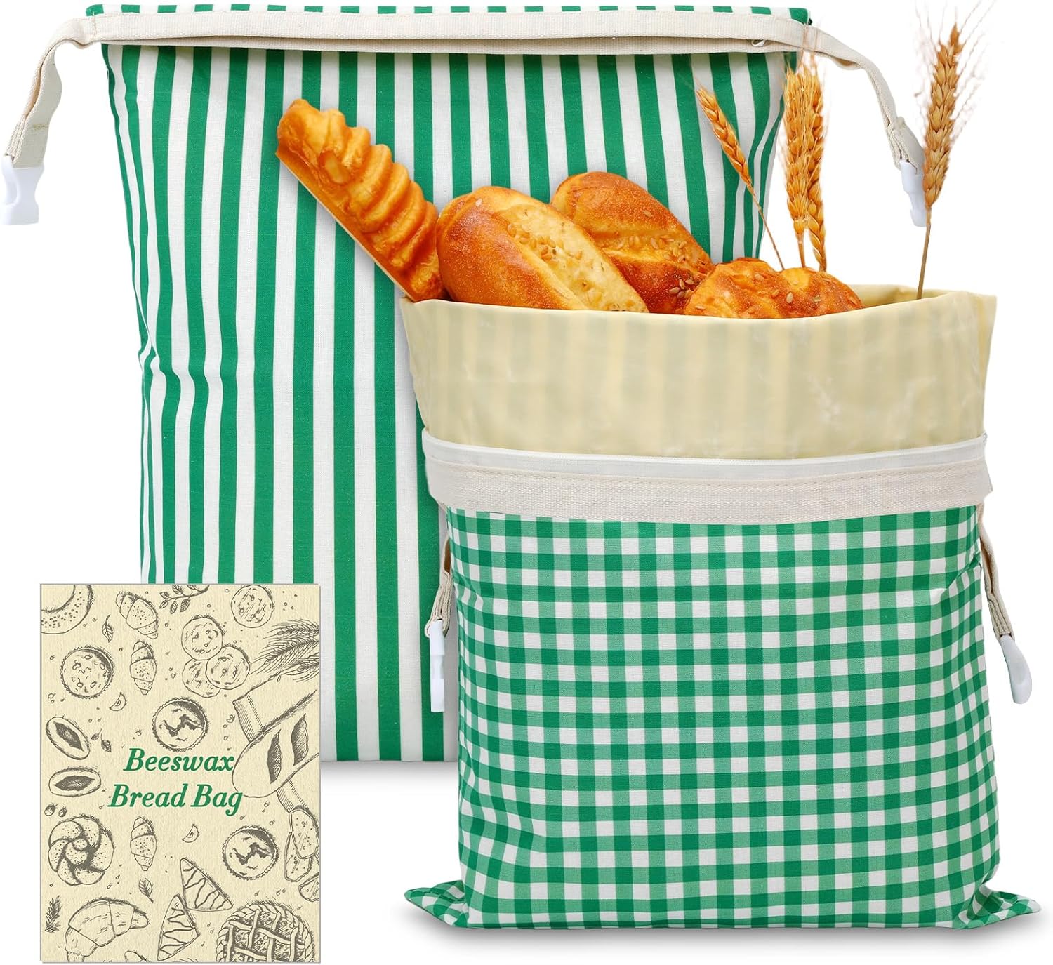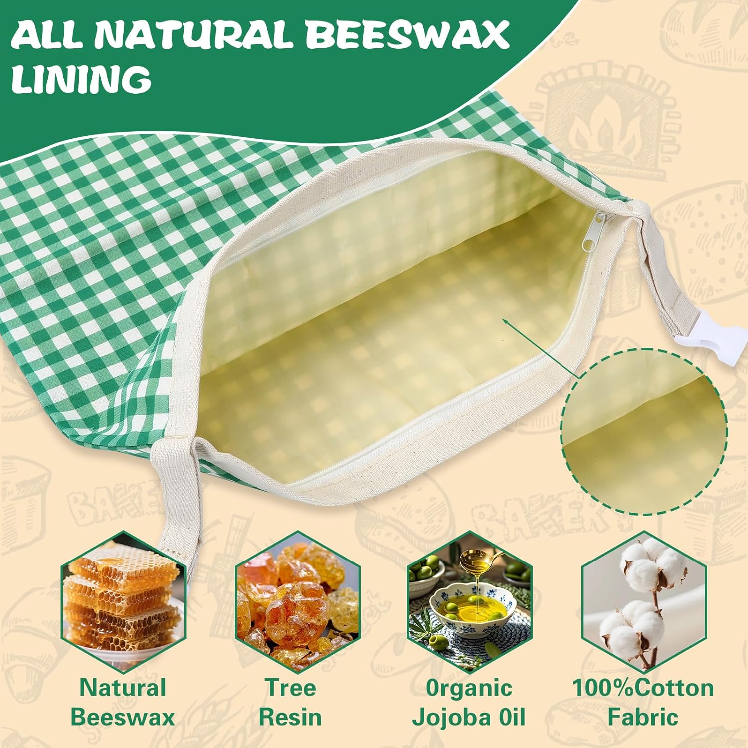 Augshy 2 PCS Beeswax Bread Bags, Beeswax Bag with Zipper Green Plaid Stripes Reusable Cotton Material Large Capacity Food Storage Bags for Sourdough Homemade Bread Boxes