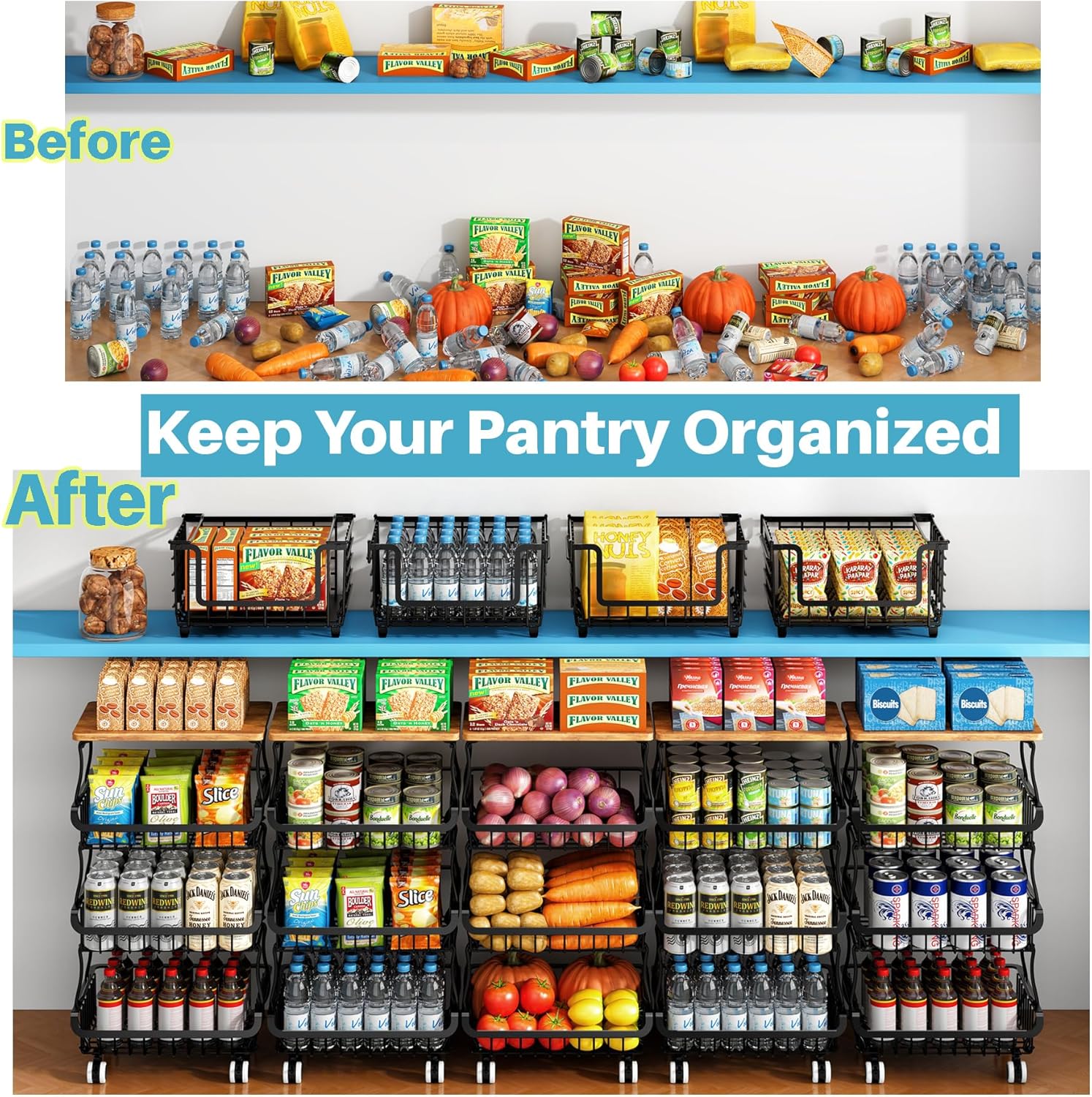 - Flexible & Space-Smart Design:Attach lockable wheels for a mobile pantry organizers and storage, or switch to non-slip feet for a stable countertop organizer. Fits neatly under shelves or on kitchen counters to maximize space.