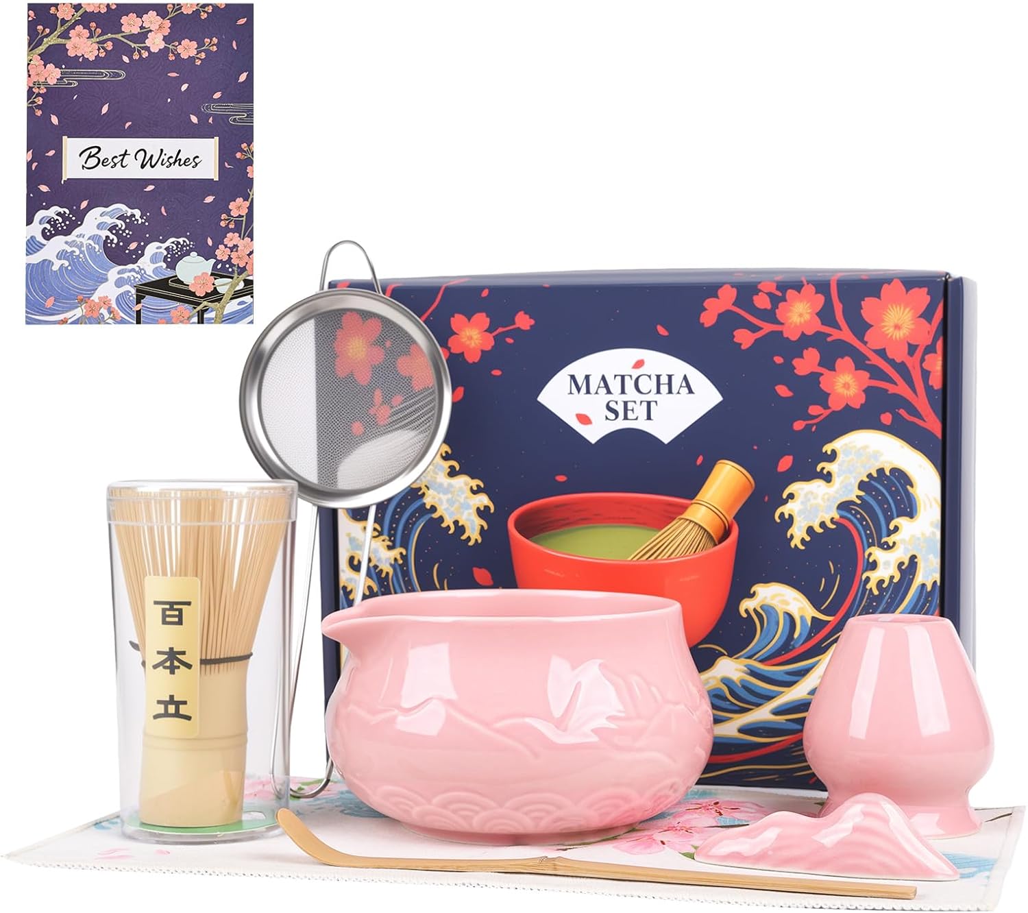 Matcha Whisk Set with Bowl, 8 Pcs Matcha Kit with Ceramic Holder, Scoop Holder, Sifter, Tea Towel, Greeting Card, Bamboo Whisk and Scoop, Pink Christmas Gift for Tea Lovers