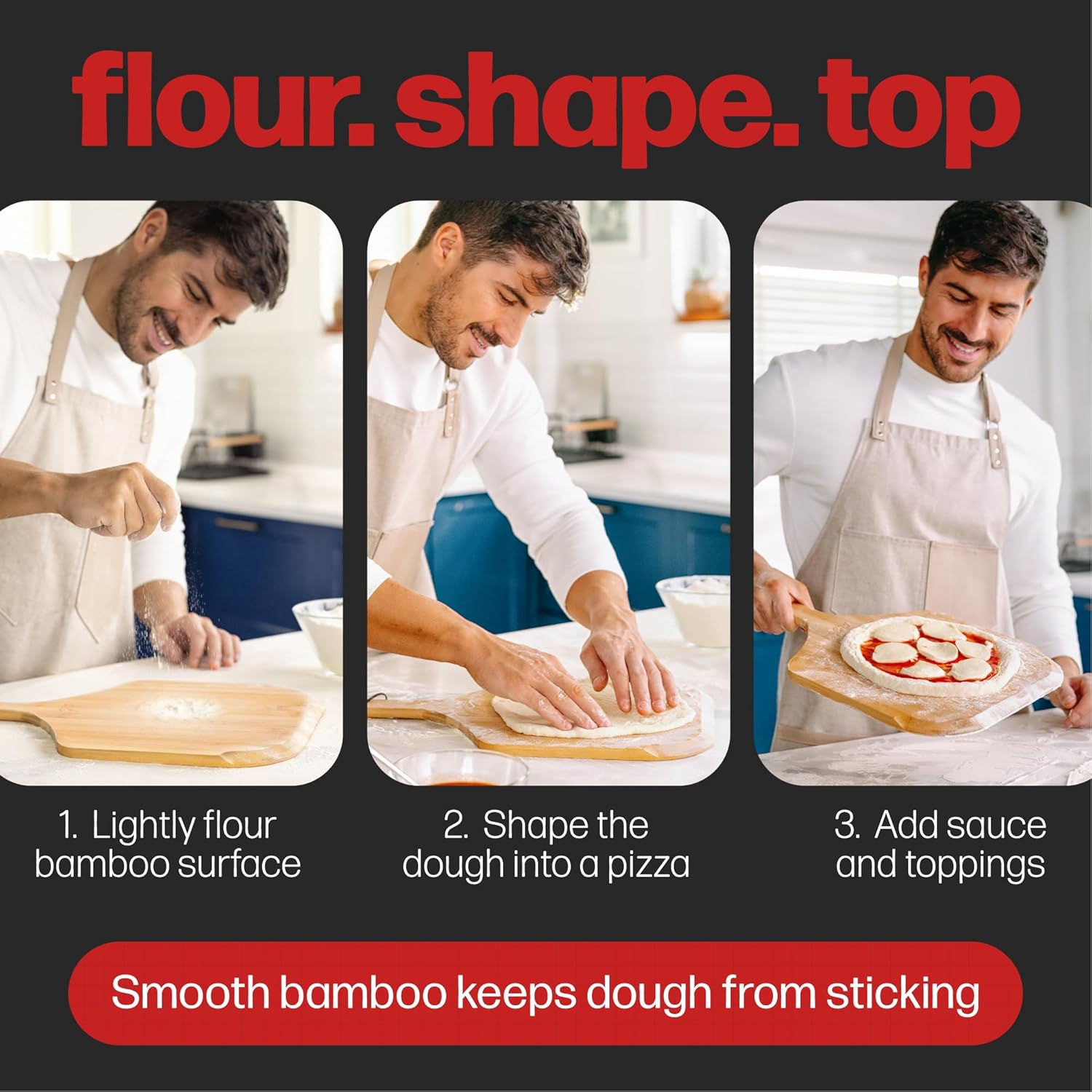 - COMFORT HANDLE - Enjoy effortless pizza transfers with our bamboo pizza peel’s long, tapered handle. Keeps hands safely away from oven heat while providing a comfortable grip. This perfectly sized 12 inch pizza peel fits all standard home ovens, making pizza night safe, easy, and enjoyable.